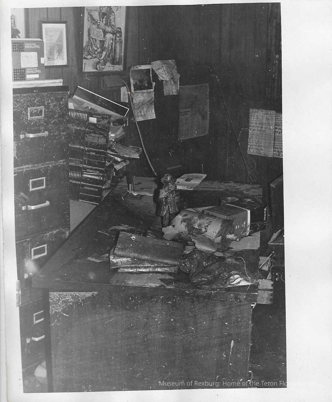 This photo is black and white and shows an office room that was flooded by the breaking of the Teton Dam. We can also see how a lot of stuff was displaced by the flood waters. There is also a lot of stuff that is now covered in mud and is soaked in water. This photo is 7 x 5.5 inches big. This photo comes from the old Standard Journal Warehouse located at 23 S 1st E.