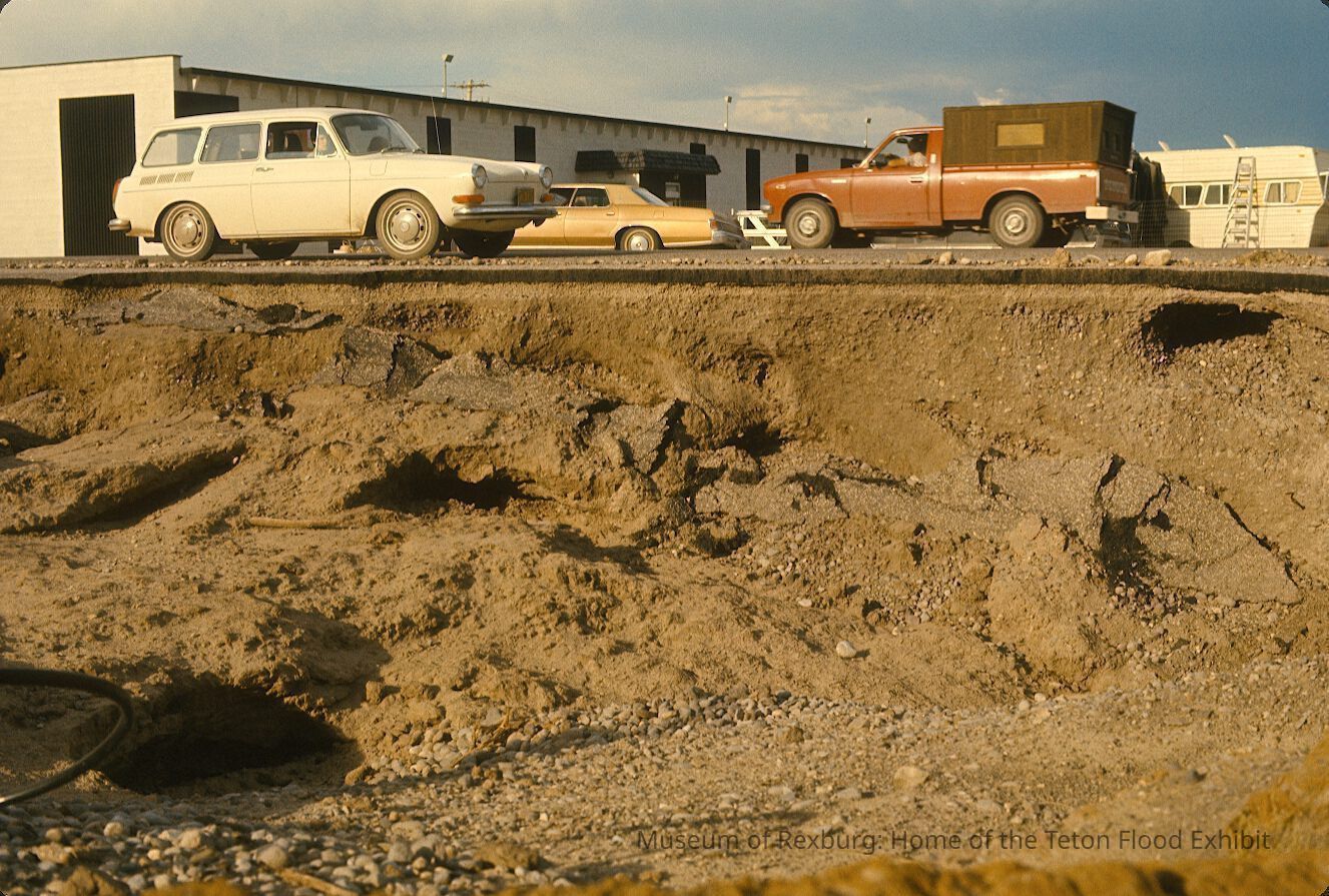 The photo was taken in colour. The photo was taken later in the day. The subject of the photo is a collapsed portion of the road, and a part of the parking lot. In the parking lot is a white car, orange pickup truck with a brown bed case, a gold car, and a white trailer RV. The store in the shot is a white brick storefront and has black accents. The photo is a part of a digital collection donated to the museum by Rick Davis.