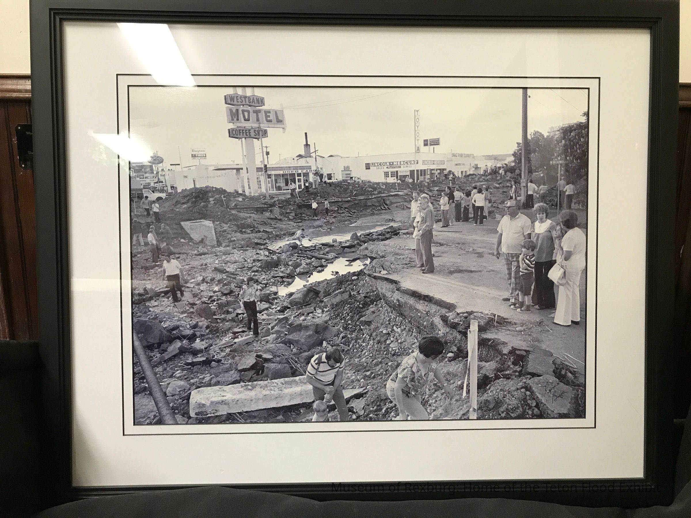 This photo is black and white and shows people admiring the trench that was built around the Broadway Bridge in order to save the bridge. This photo is on display in the flood room in the museum. It is in a black frame with a white border around the photo. This photo is 25.5 x 31 inches big.