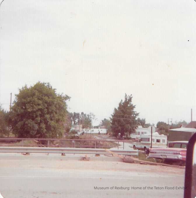This photo is in color. It appears to have a partially flooded road in the foreground. There is a subdivision behind the road with trees and bushes. This picture is 3.5 x 3.5 inches big.