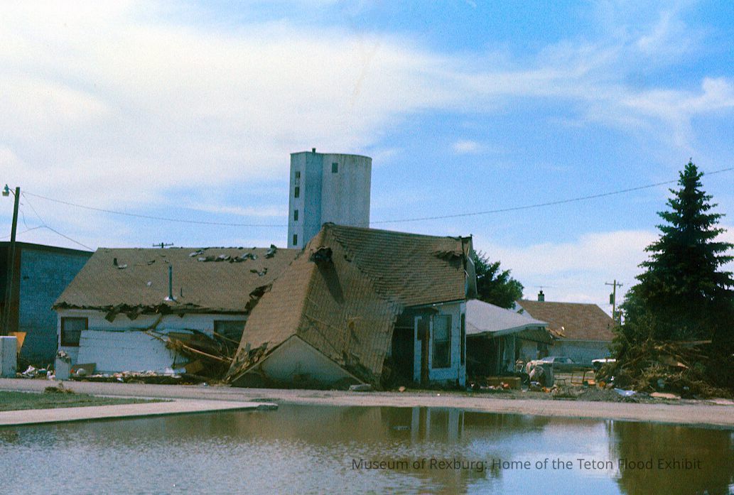 This photo was taken in colour, and was shot on West Main in Sugar City. The subject of the photo is a house that is partially collapsed. The Front portion of the house collapsed leaving ripples in the roofing and debris scattered throughout yard. The foreground to the photo is a flooded street. he photo is a part of a digital collection donated to the museum by Rick Davis.