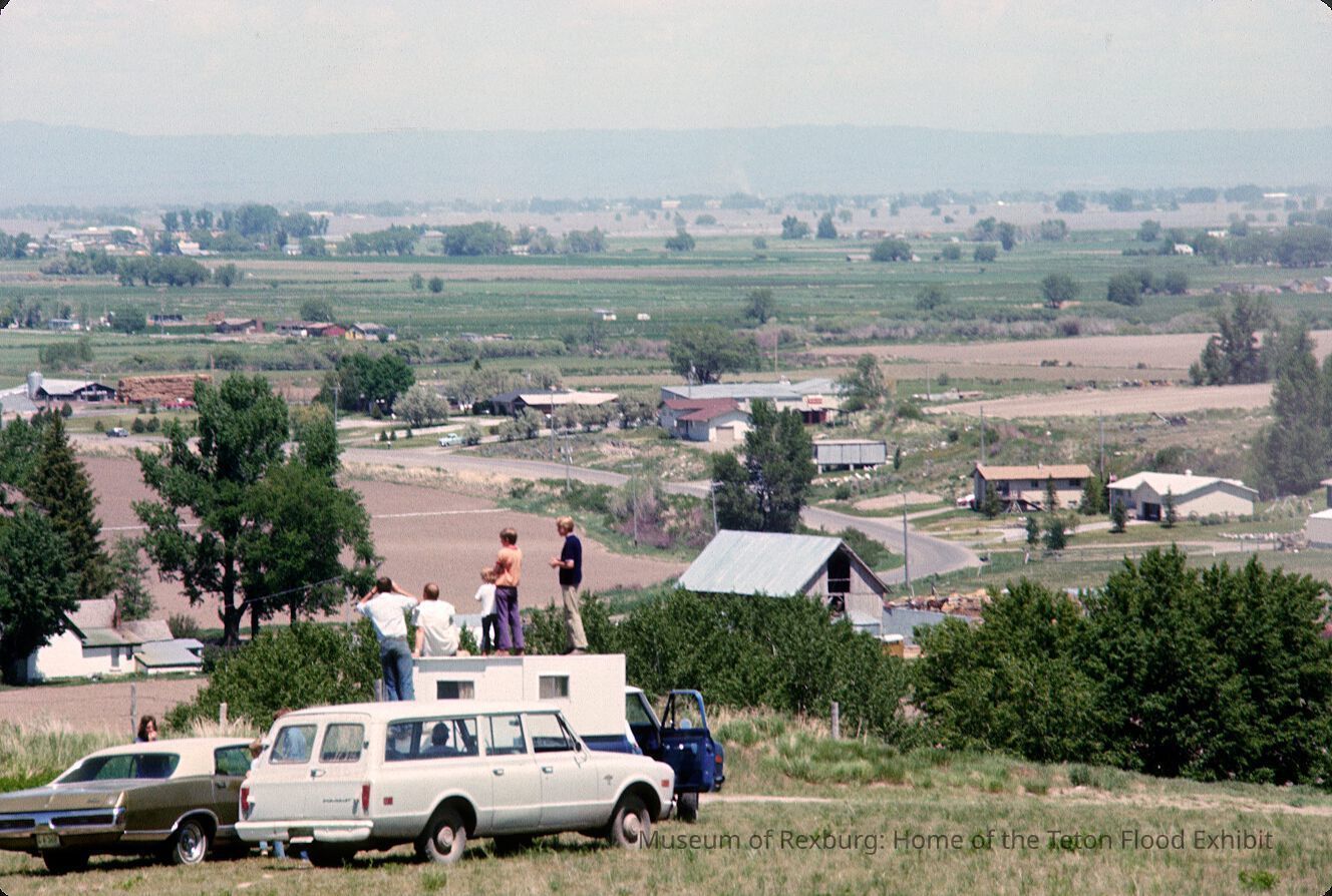 The photo was taken in colour. The subject of the photo is a family standing on top of a camper trailer looking North East. One person standing on the trailer is wearing bellbottom violet pants with a Salmon top, the other is wearing khaki pants with a black top. The photo is a part of a digital collection donated to the museum by Rick Davis.