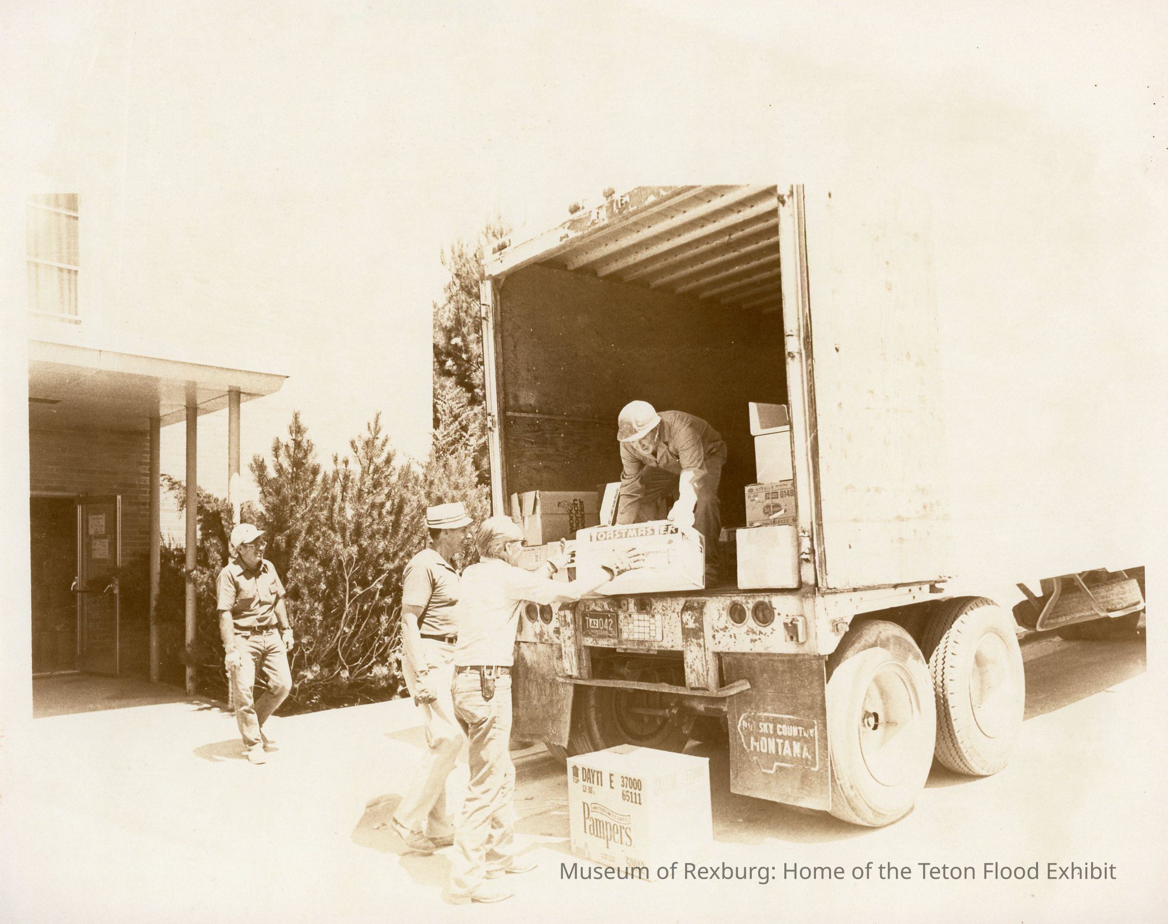 The photo was taken in black and white. The subject of the photo is people unloading fruit crates and general goods boxes. It seems this may have been part of the relief effort to help the community receive food and necessities. The dimensions of the photo are 8" 11" This photo comes from the old Standard Journal Warehouse located at 23 S 1st E.