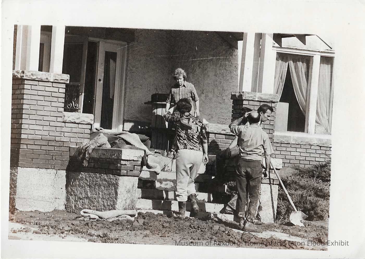 The photo was contained in a brown envelope with "Thanks Dave Gauts" written in cursive. The subject of the home is a group of people shoveling flood mud from their walkways and from their yard. A couple of them seem to be conversing on the steps. There are some rugs sitting on the porch. All the people in the photo are wearing boots, long pants, and short sleeved shirts. The dimensions of the photo are 5" X 7". This photo comes from the old Standard Journal Warehouse located at 23 S 1st E.