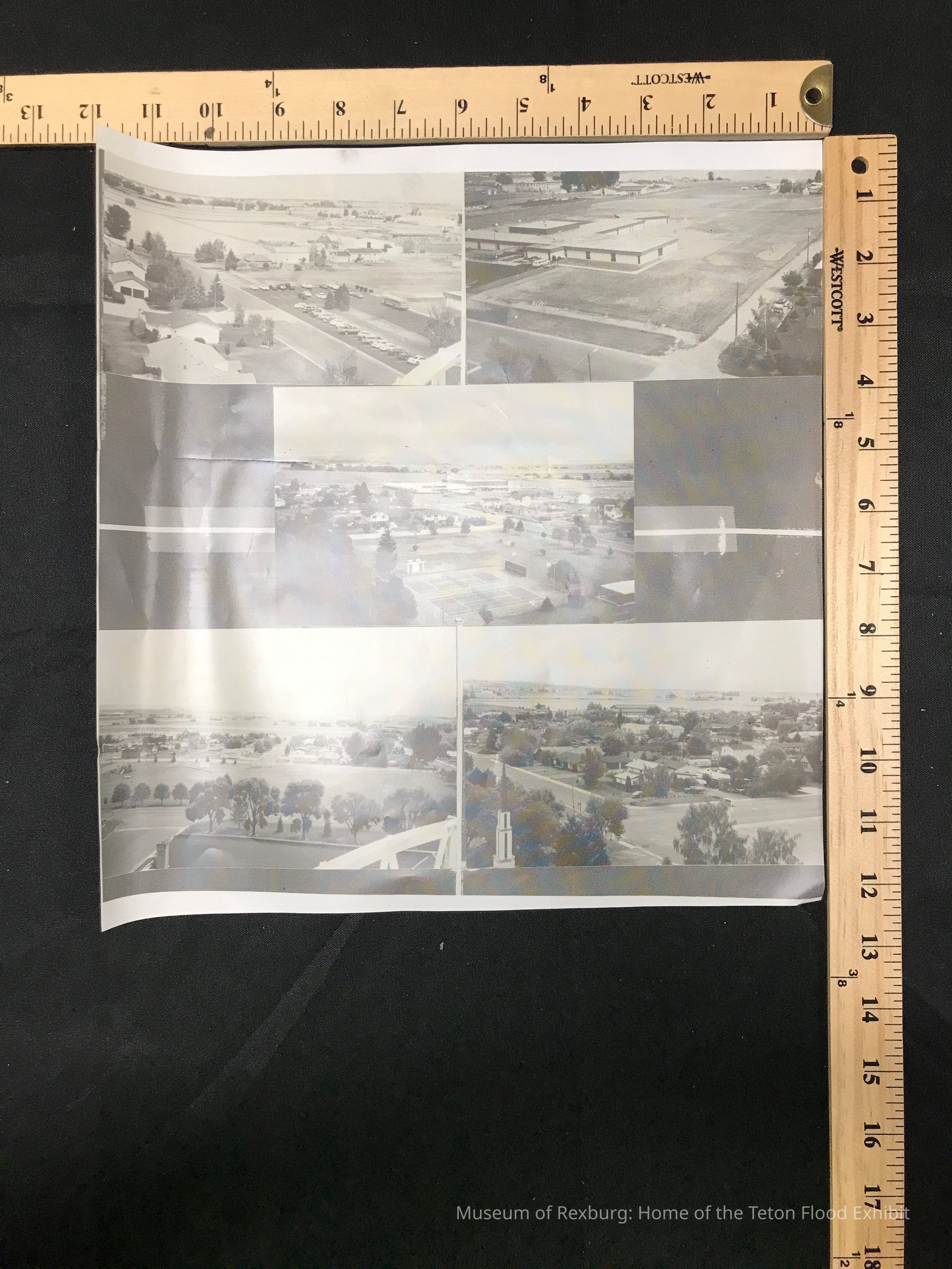 There are five photos in this picture. They are all black and white. There are two on top, one in the middle, and two on the bottom. In the upper left hand corner, this photo is 3 col Sugar City 1995 looking N from Water Tower Pix by Lawrence Nielson. In the upper right hand corner the photo is of 3 col Sugar City 1995 looking NE from water tower at Central 2 Kershaw schools Pic by Lawrence Nielson. The center photo is of col Sugar City 1995 looking E from water tower at high school pix by Lawrence Nielson. The bottom right photo is of 3 col Sugar City 1995 looking Southwest at town toward Rexburg pix by Lawrence Nielson. The bottom left photo is of 3 col Sugar City 1995 looking South at Heritage Park and town pix by Lawrence Nielson. This photo is 12.5 x 12 inches big. This photo comes from the old Standard Journal Warehouse located at 23 S 1st E.