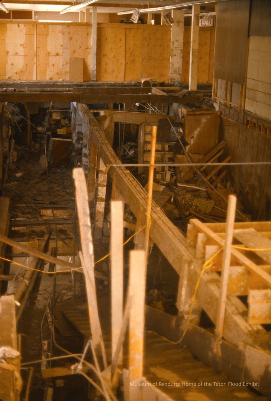 The photo was taken in colour. The subject of the photo is the basement of Porters Bookstore. The floor has completely collapsed under the weight and strength of the flood waters. The walls have been stripped clean, and only the supports to the floors remain. The photo is a part of a digital collection donated to the museum by Rick Davis.