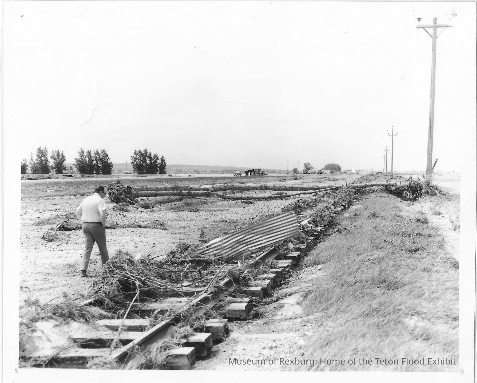 This photo is an 8x10 and is black and white and is also laminated. The railroad tracks in the photo are covered with trees and metal pieces. There is a man walking besides the track on the left. The man is wearing dark pants and a white shirt and is wearing glasses.