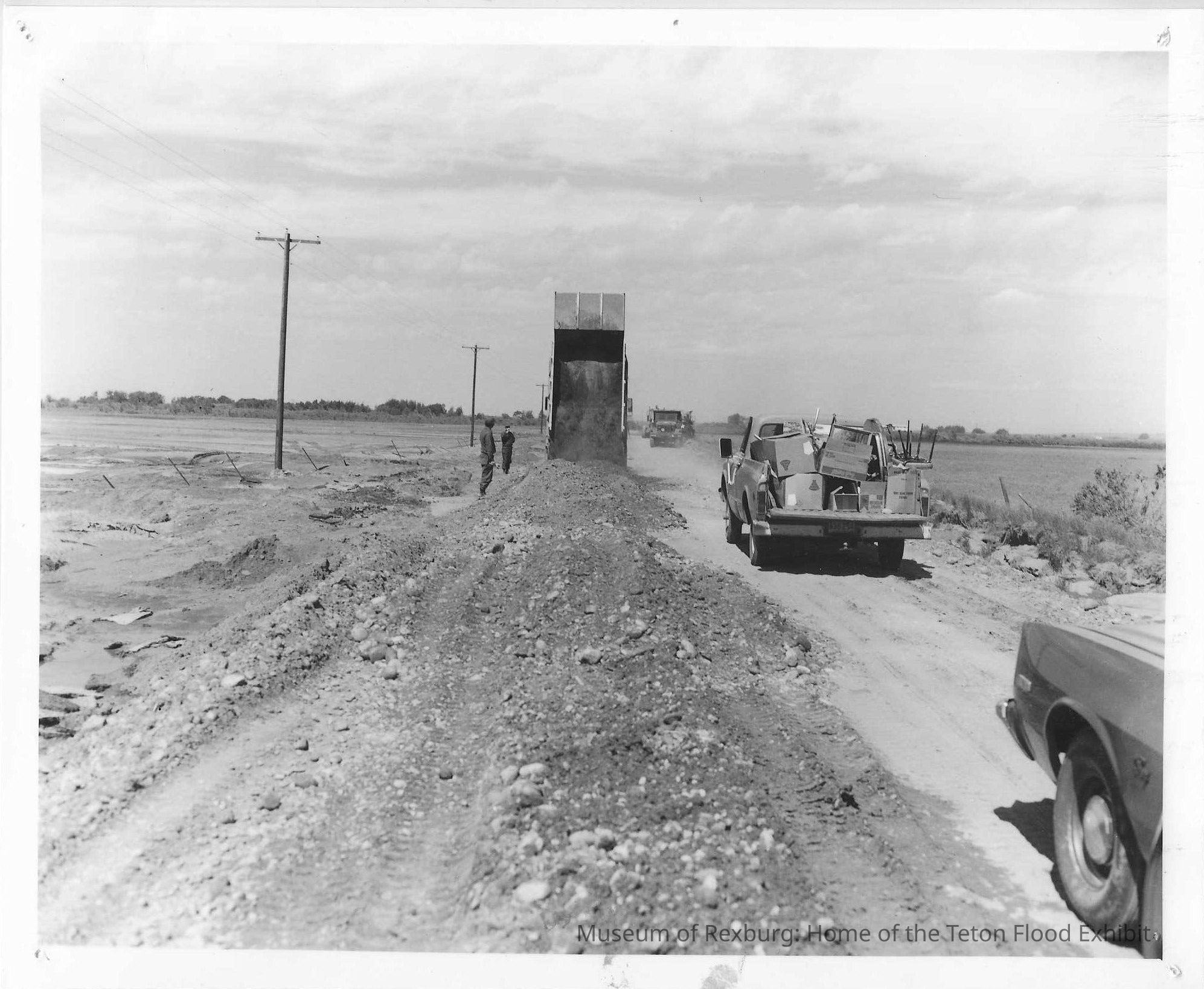 This photo is an 8x10 and is black and white and is also laminated. A dump truck is seen dumping gravel on a road that has been damaged. There are two men besides the dump truck on the left. There is another truck seen with boxes and household images driving on the undamaged part of the road. There is the front part of a car in the bottom right corner. There is a large truck heading towards the loaded truck.