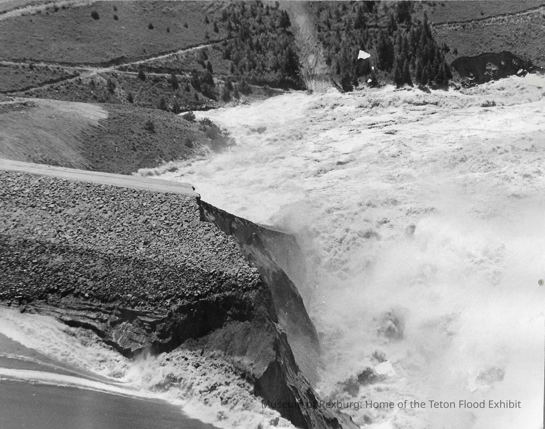 This photo is black and white and it shows the reservoir that was behind the dam at the time erupting through the now breached dam. We can see the rest of the water heading down the canyon. On the back of the photo there is a blue pen made mark that says "RS". This photo is 7.5 x 9.5 inches big. This photo comes from the old Standard Journal Warehouse located at 23 S 1st E.