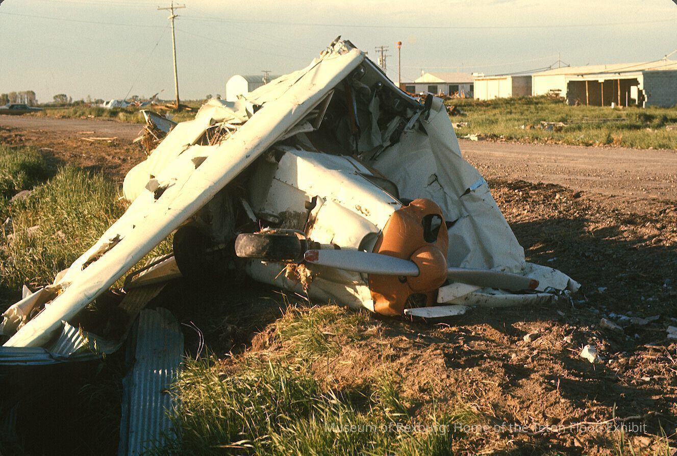 The photo was taken in colour. The subject of the photo is the Rexburg airport after it was hit by the flood. The focus of this photo is a mangled plane that appears to have been dragged through the vicious waves of the flood. The plane is a white colour with an orange nose. The photo was taken later in the day as the sun appears to be setting. The few buildings in the shot have portions of their walls collapsed due to the roiling waters of the flood. The photo is a part of a digital collection donated to the museum by Rick Davis.