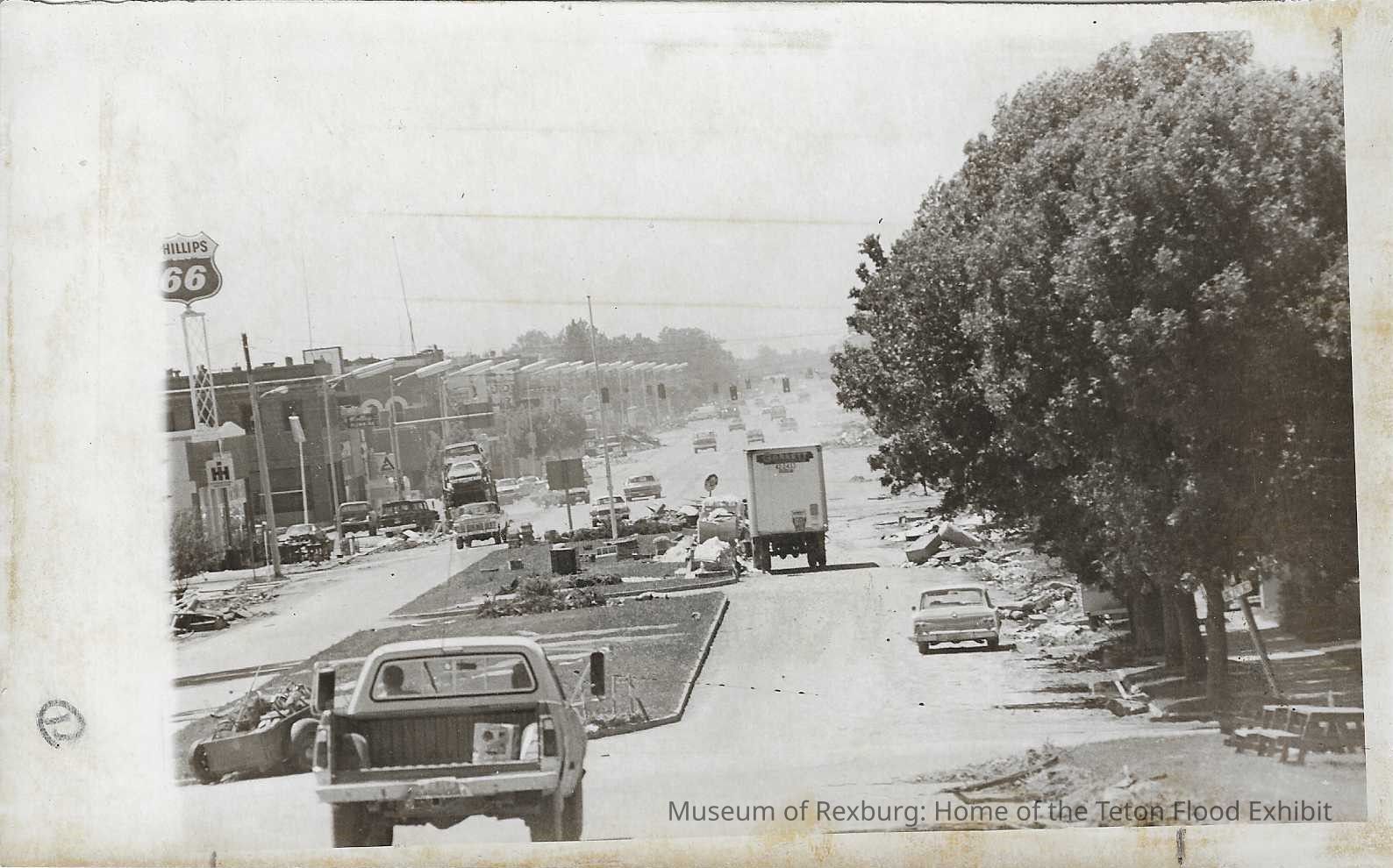 This photo is black and white and shows traffic driving down Main Street in Rexburg with all the debris that was left behind by the flood. We can see how the roads have been cleared from the debris but the debris has just been pushed to the side of the road. This photo is 5 x 8 inches big. On the back of this photo it is written "200%". This photo comes from the old Standard Journal Warehouse located at 23 S 1st E.