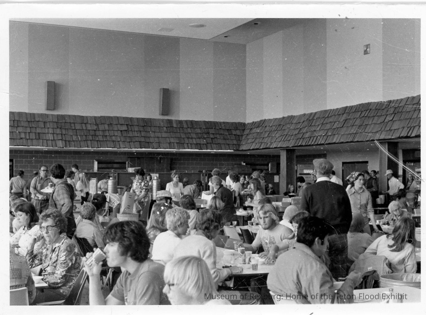 This photo was taken in black and white. The subject of the photo is the Rick's Cafeteria with a crowd of people eating. After the flood devastated Rexburg, many people went to Rick's for food and shelter while they waited for the flood waters to recced. The dimensions of the photo are 5 in X 3.5in.