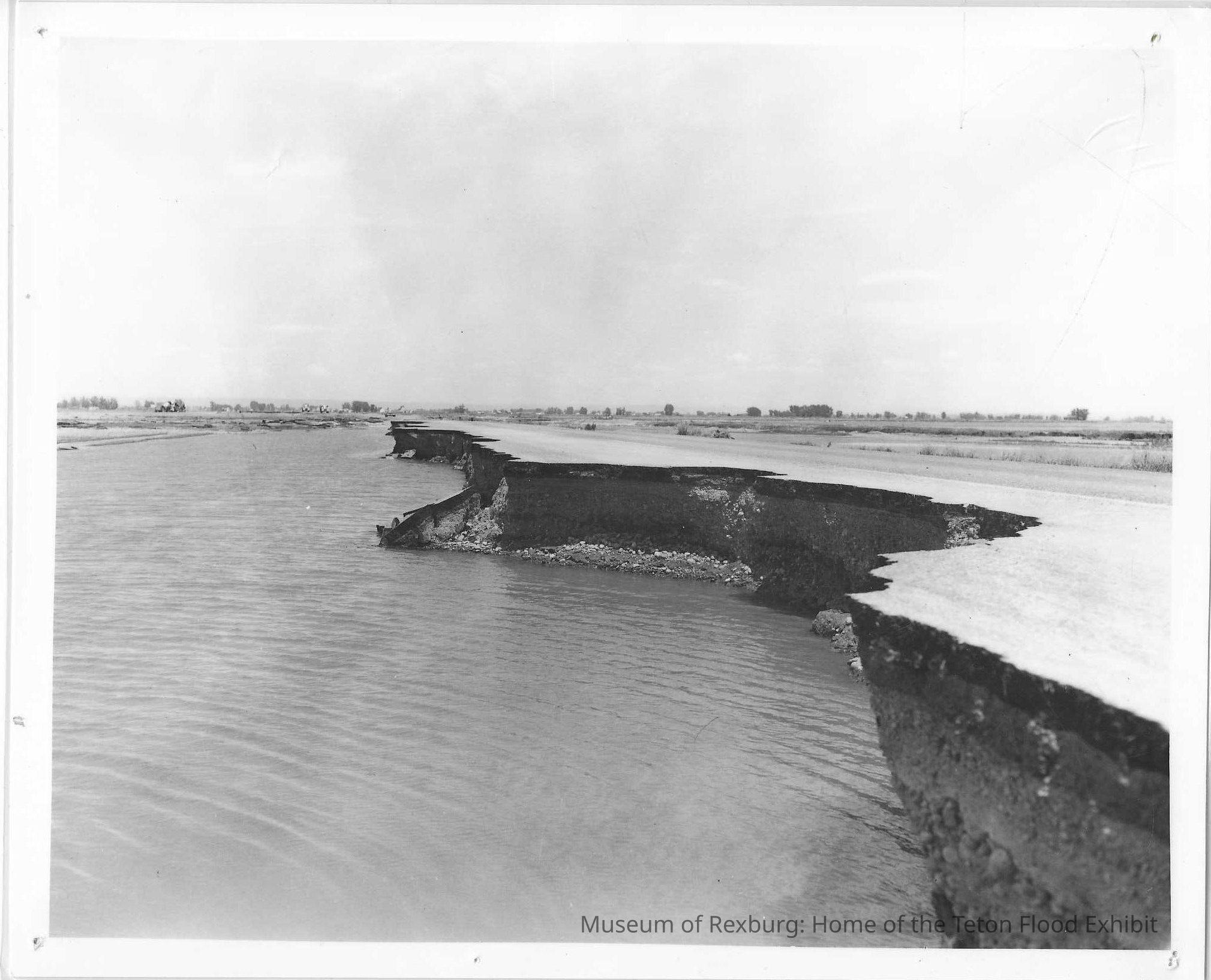 This photo is laminated. This photo is 8 x 10 inches. This photo is black and white. This photo shows a road that has been drastically damaged by the food waters that came through. We can see the road to the right of the photo and the water to the left of the photo.