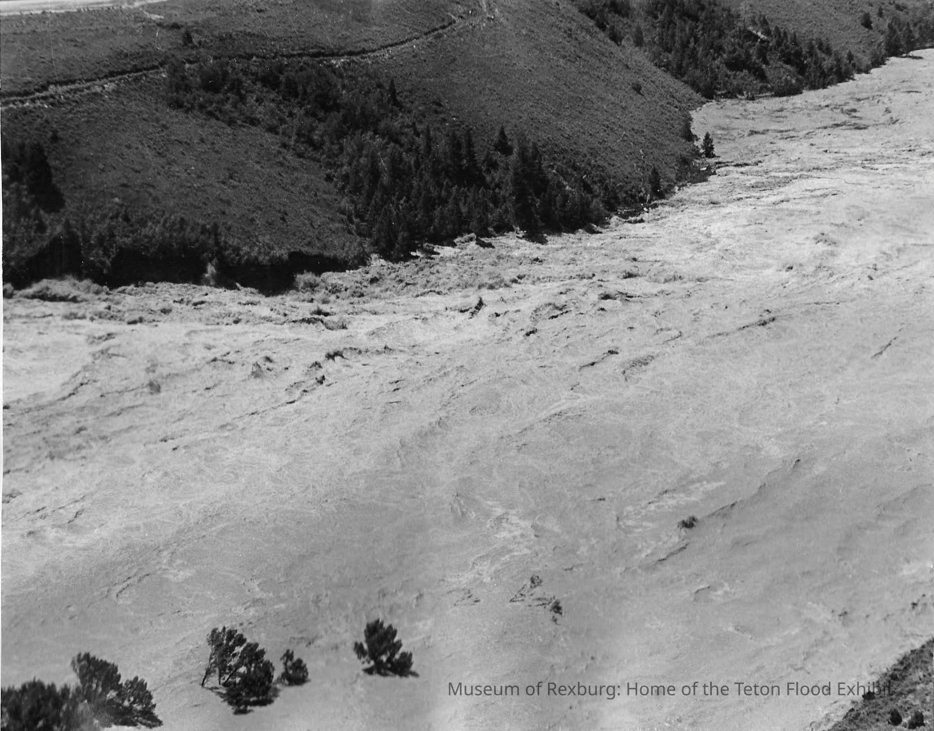 The photo is in black and white. The subject of the is the snake river overflowing with the reservoir waters. Within the waters are several trees being carried downstream. The majority of the picture is taken up by the water spilling out of the dam. This photo comes from the old Standard Journal Warehouse located at 23 S 1st E.