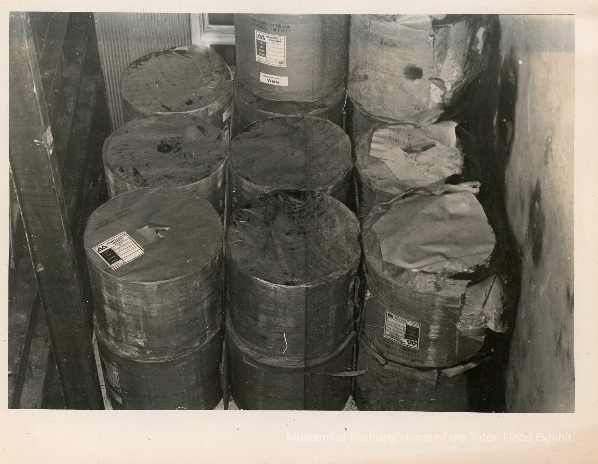 These barrels are marked 'Rexburg Standard Journal' the one on top in the back also reads 'Newsprint for 0 white'. The labels read: 'Powel River Alberni Newsprint'. The barrels against the right side of the wall, the lids look like they've been damaged. Possibly they are all flood damaged. The photo is 7x5.25. This photo comes from the old Standard Journal Warehouse located at 23 S 1st E.