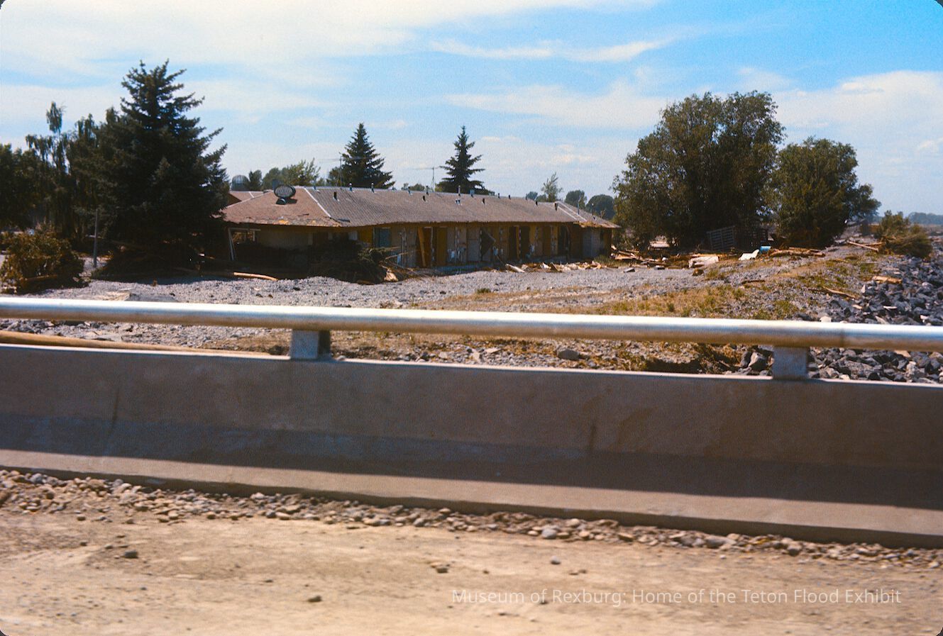 The photo was taken in colour. The subject of the photo is a motel off the south bridge. The area the photo was taken has dried vegetation, and trees. The area looks as though it hasn't seen water in days. The motel in the photo has had some of the rooms taken out by the flood waters. The photo is a part of a digital collection donated to the museum by Rick Davis.