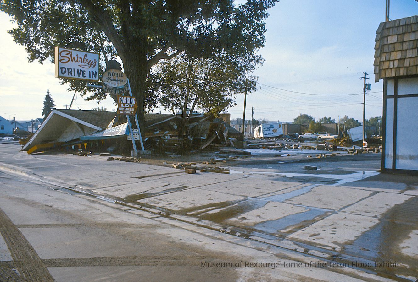 This photo was taken in colour and on Main and 2nd W on July 7. The subject of the photo is Shirley's Drive-in theater. The snack area and payment area is completely destroyed. The debris of the building is surrounding the trees that are on the lot. The photo is believed to have been taken after the flood waters receded. The photo is a part of a digital collection donated to the museum by Rick Davis.