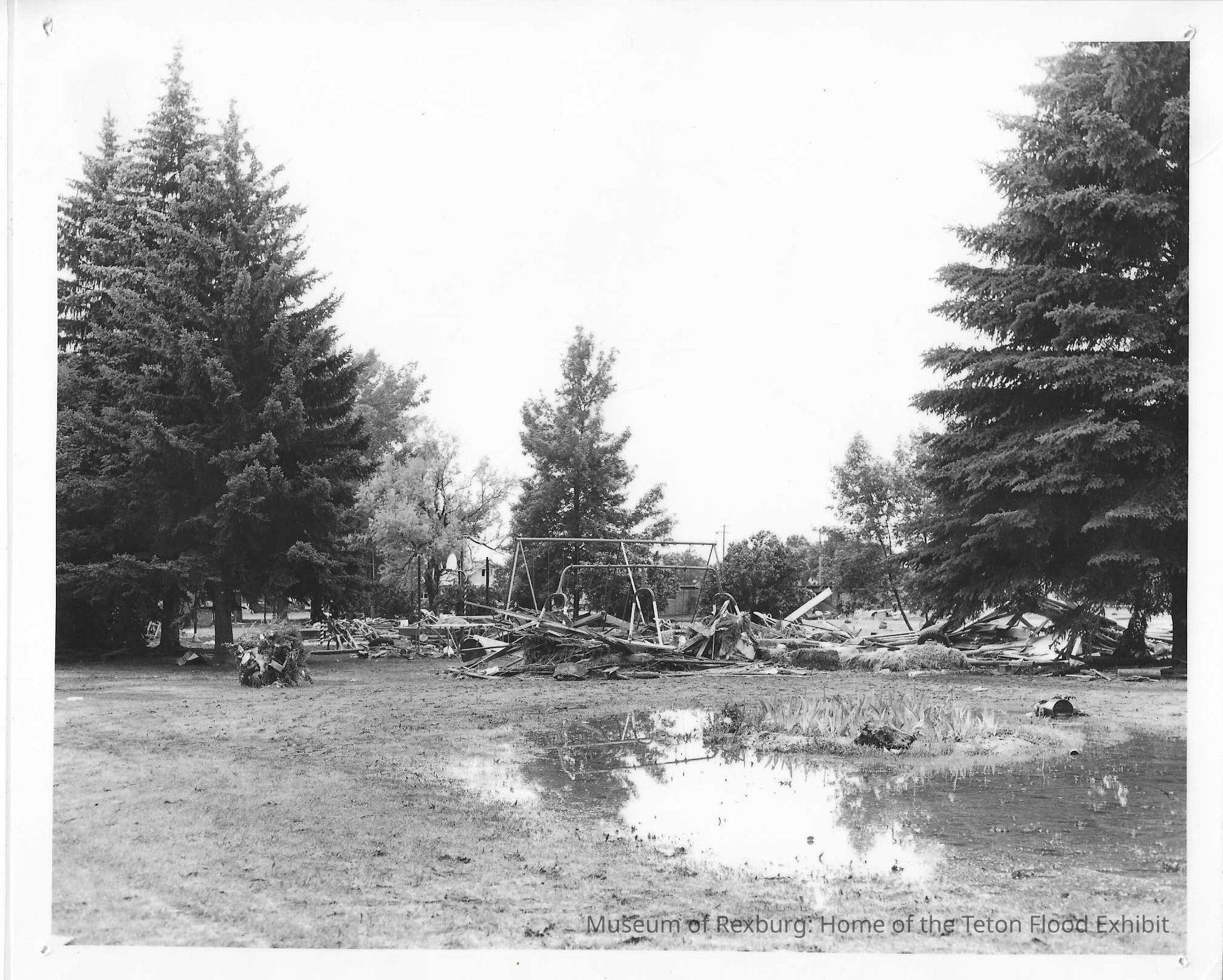 This photo is laminated. This photo is 8 x 10 inches. This photo is black and white. This photo shows Smith Park after the water has receded after the flood. We can see pine trees and a swing set. There is a small note that reads, "Smith Park with the debris left after the water went down".