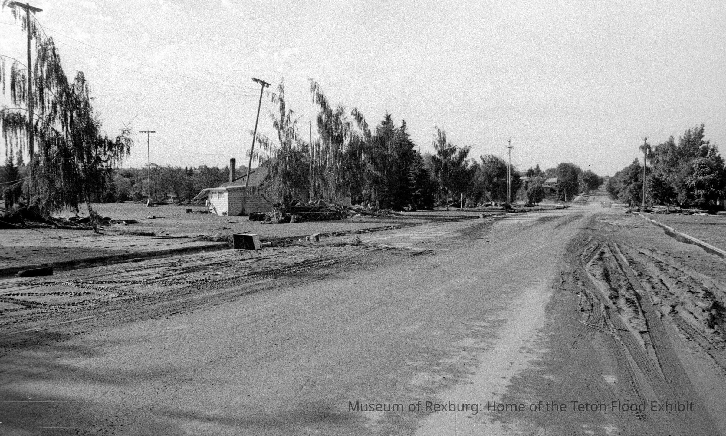 This photo was taken in black and white. The subject of the photo is a road near Smith Park looking south down the road. The road is completely covered in flood mud. The photo contains a few random houses in the shot that look as though they were drifted off their foundations. The photo is a part of a digital collection donated to the museum by Rick Davis.