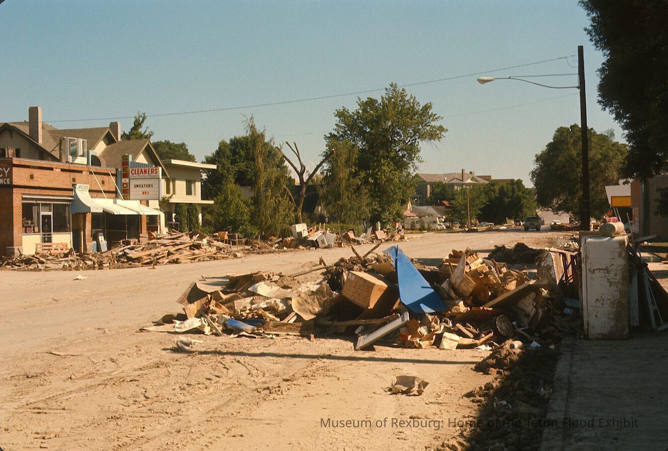 The photo was taken in colour. The subject of the photo is South on Center St. The road is a relatively larger road. On each side of the road are piles of debris made up of paper, wood, furniture, appliances, and whatever was touched by the flood. The asphalt on the road is covered in a thick layer of flood mud. The photo is a part of a digital collection donated to the museum by Rick Davis.