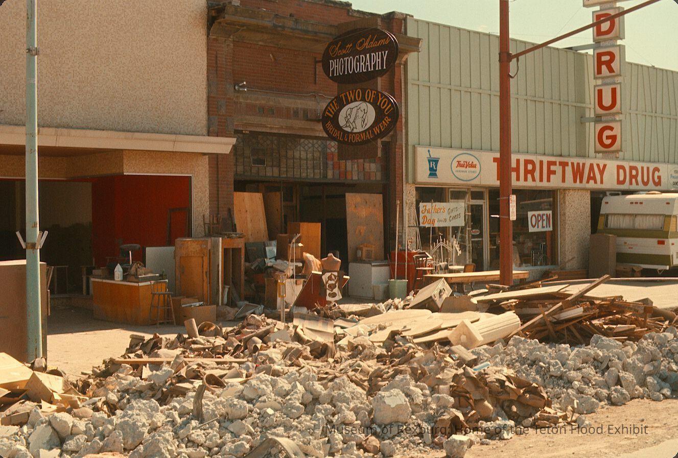 The photo was taken in colour. The subject of the photo is South Side of Main Street west of College Ave. There are two known store fronts in the shot of the photo. The centre is "Scott Adams Photography" & "The Two of You Bridal & Formal Wear" and the second main store front is "Thriftway Drug." In the foreground of the photo is rubble and wood debris. In front of the storefronts is items from inside the stores lining the streets. The photo is a part of a digital collection donated to the museum by Rick Davis.
