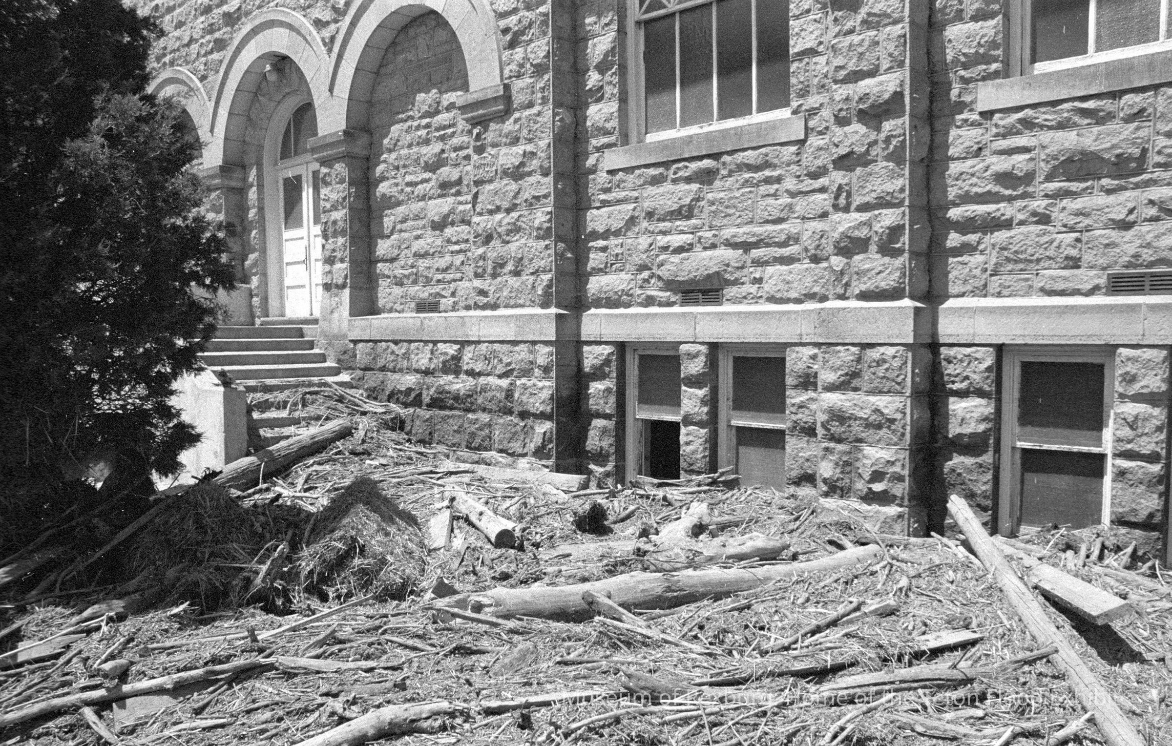 The photo was taken in black and white. The subject of the photo is the Rexburg Tabernacle's south entrance. When the photo was taken the had not been put in yet, and so only a stone staircase remains. The area in front of the staircase is covered in wood debris. The photo is a part of a digital collection donated to the museum by Rick Davis.