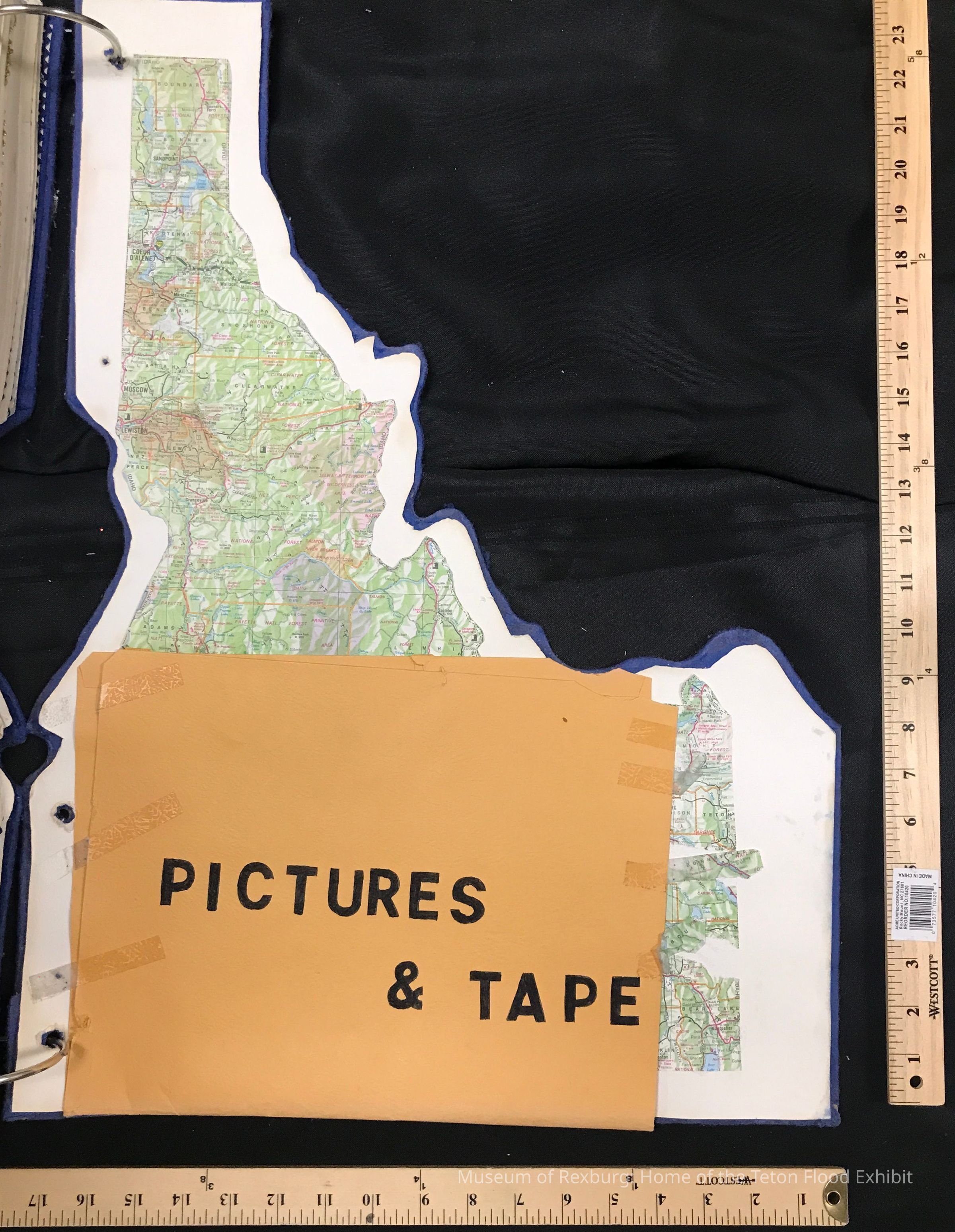 This is the back inside cover of the scrapbook. A map of Idaho is pasted onto the page, over which a folder is taped, in the bottom half of the page. The folder says "Pictures & Tape" on it and is empty.