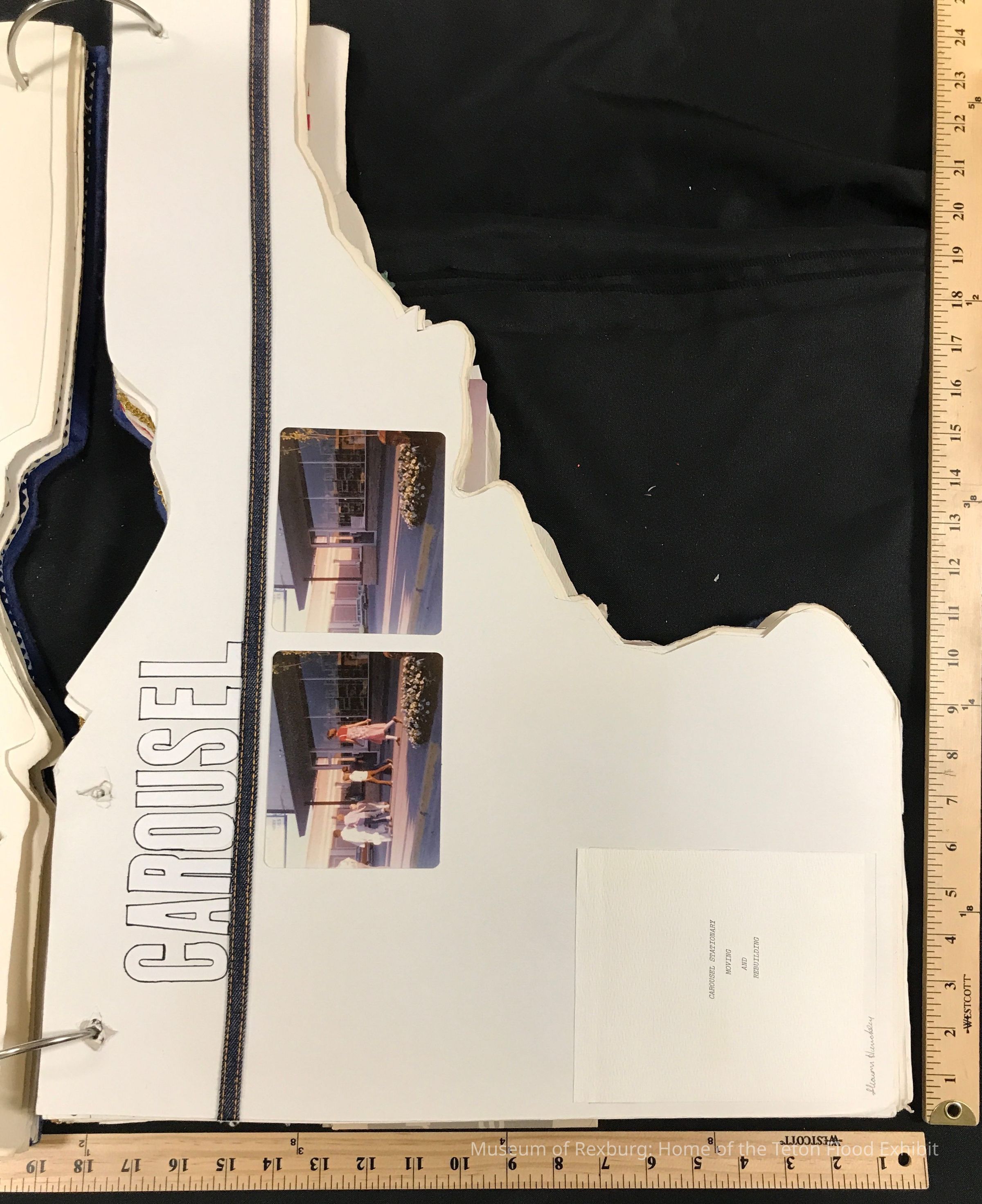 page featuring Carousel. Note reads: Carousel Stationary and office supply store changed buildings after the flood. Their store was washed completely away.
