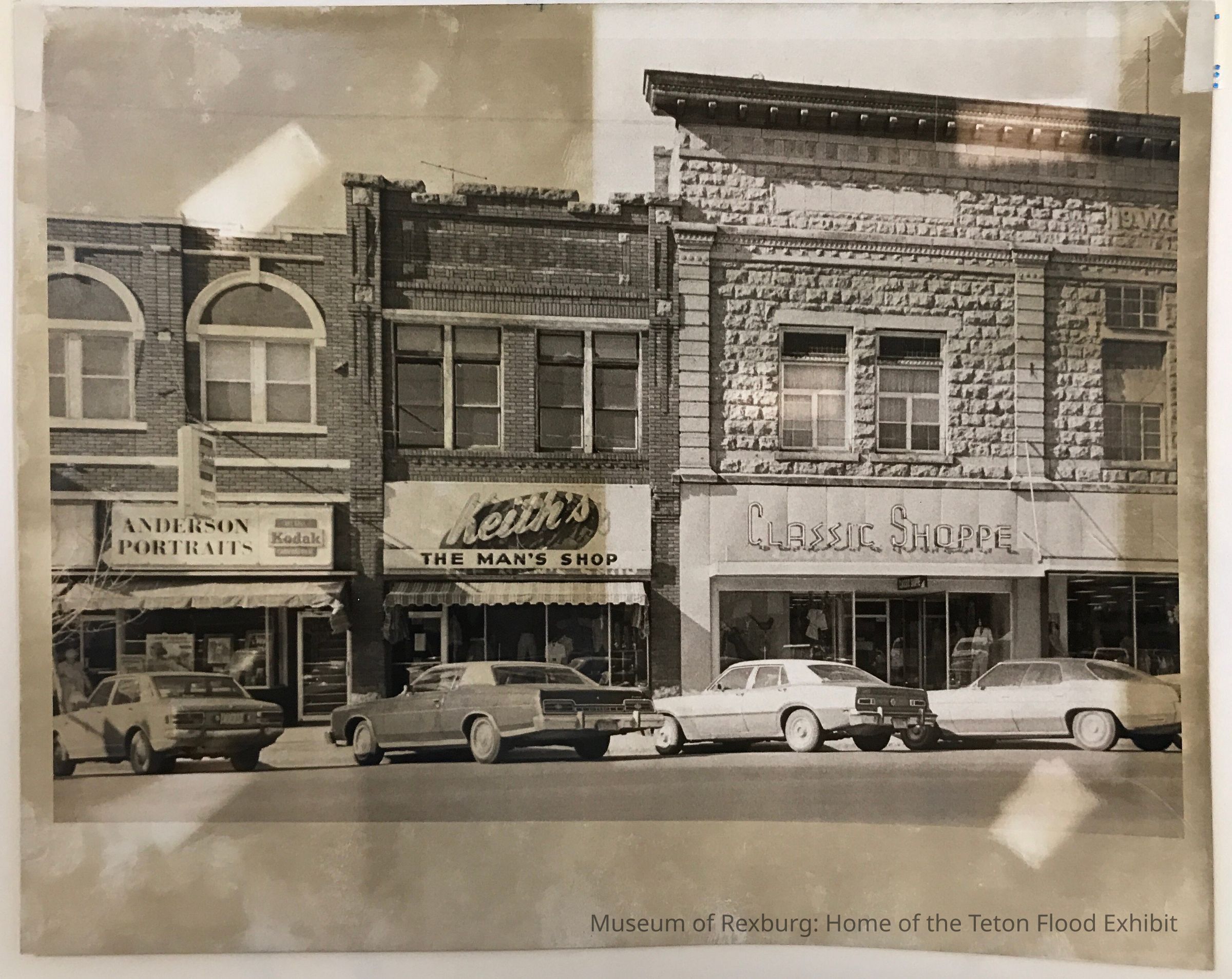 The photo is of The Classic Shoppe. It seems as though the photo was developed by hand and after the flood of the museum in 2018, it seems some chemicals rubbed off the photo and bled through to other pages. It is on the reverse side of the scrapbook page, in the bottom middle.