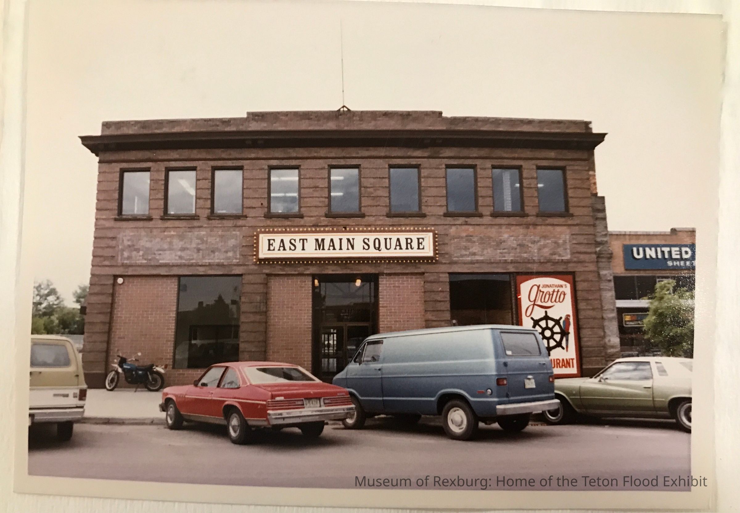 Front of East Main Square, with a sign for Jonathan's Grotto in the right hand window. This photo is on the reverse side of the scrapbook page to the far right.