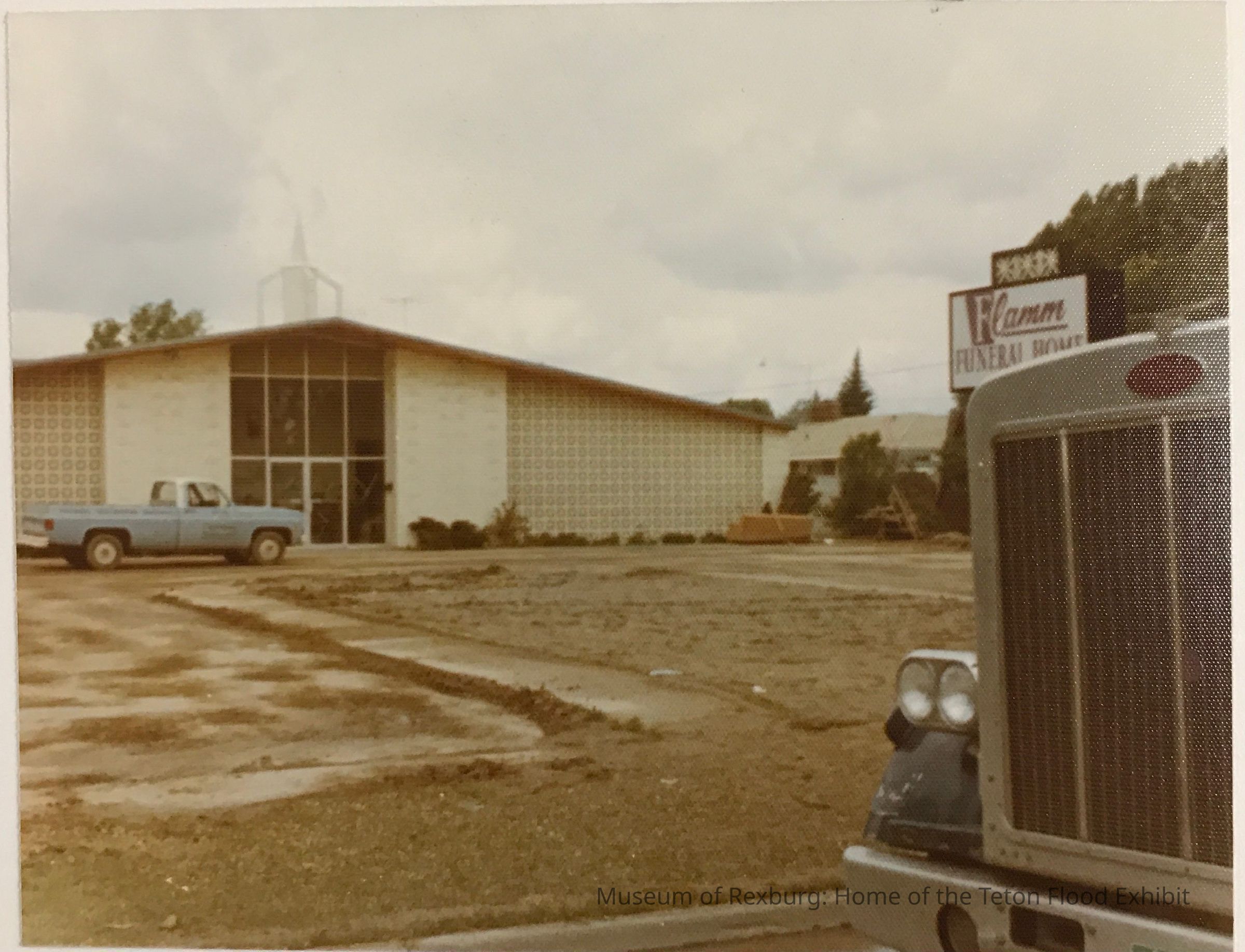 Photo of Flamm Funeral Home showing lawn damaged by flood. This photo is in the middle of the page near the top.