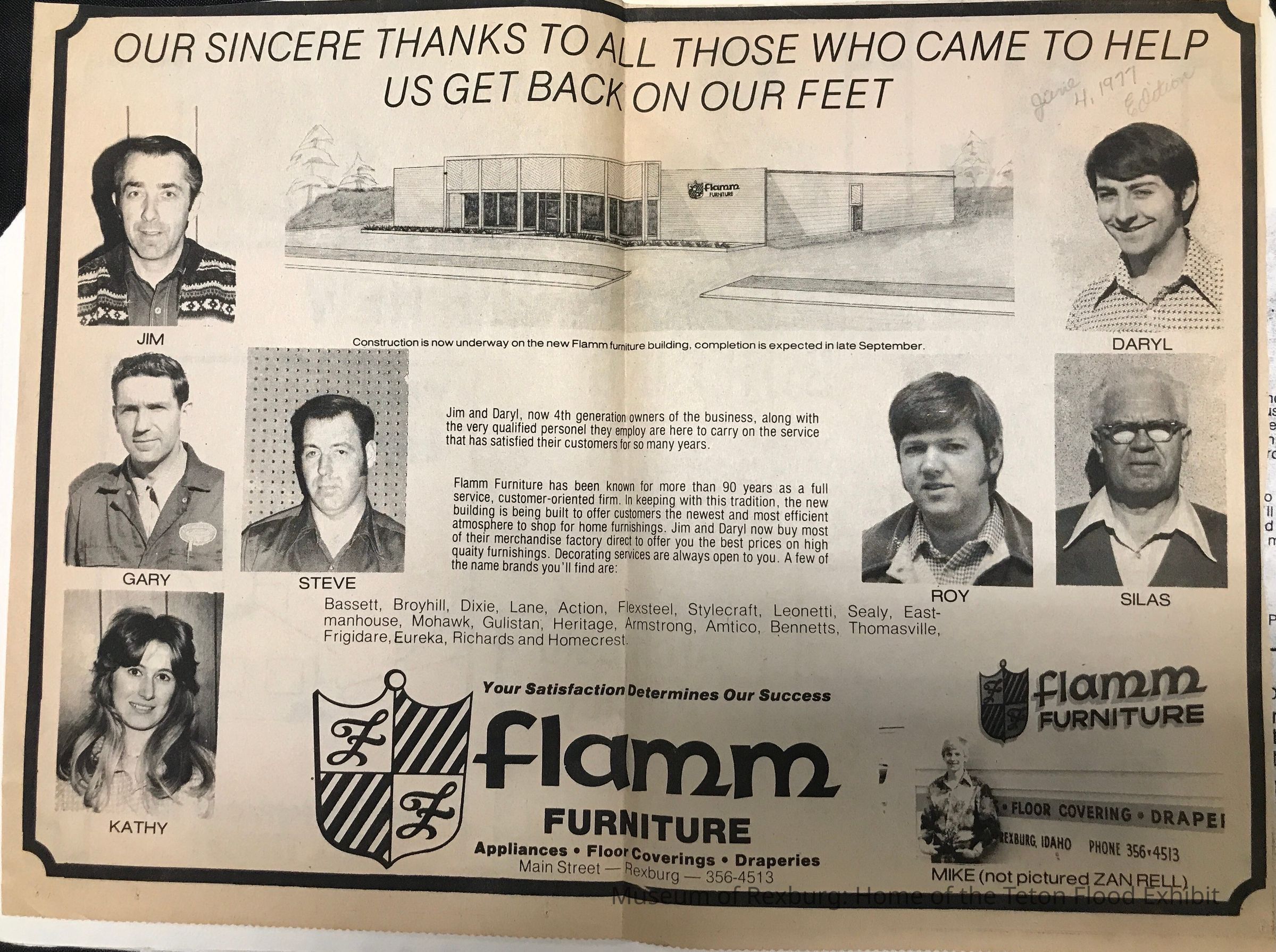 This is one of two newspaper clippings on the reverse side of the scrapbook page for Flamm Furniture. It shows a thank-you to several individuals who helped get Flamm Furniture "back on our feet".