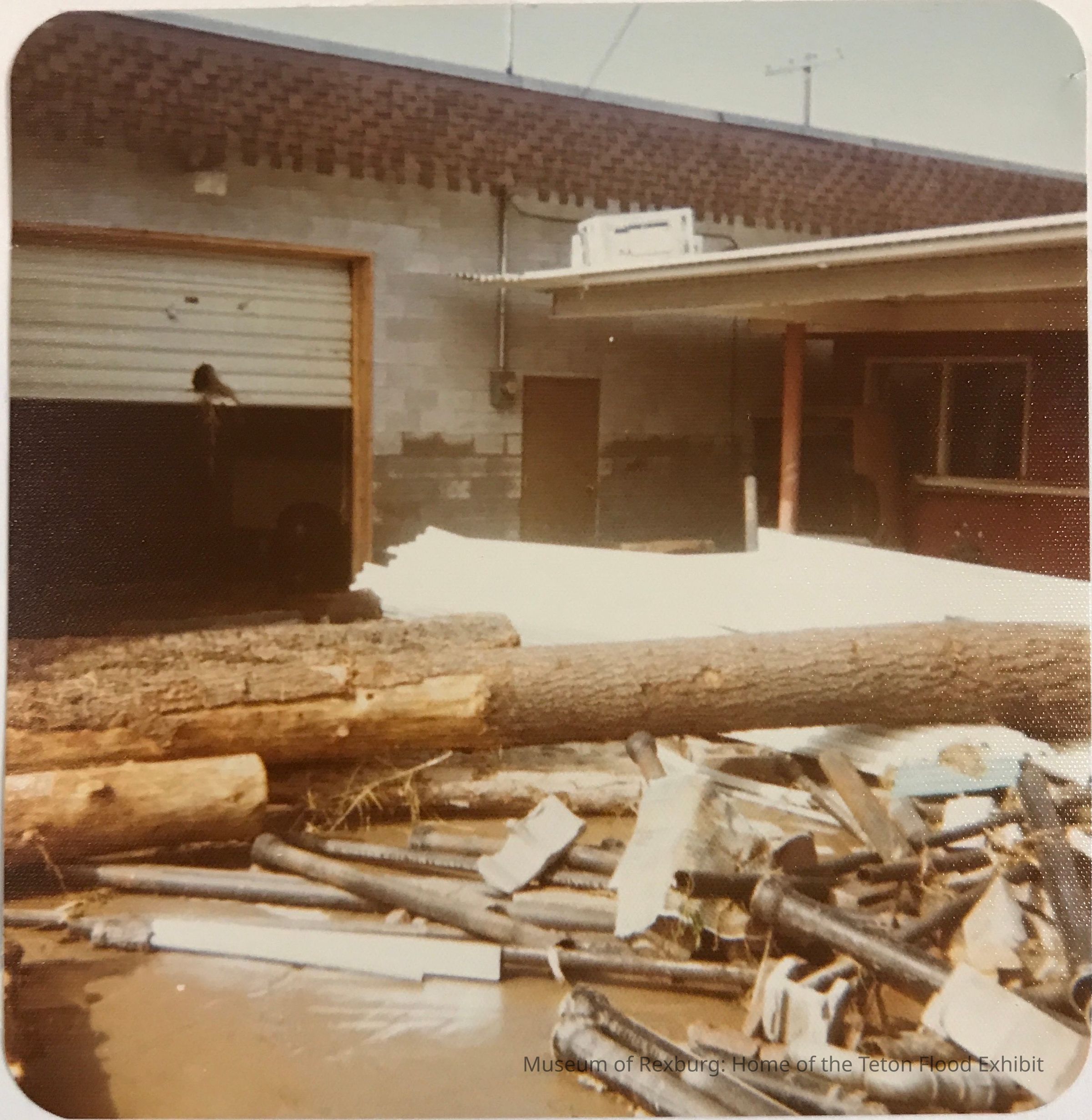 Another view of flood damage to Hill's Plumbing & Heating, showing large logs in the foreground. This photo is just below the top sideways one.