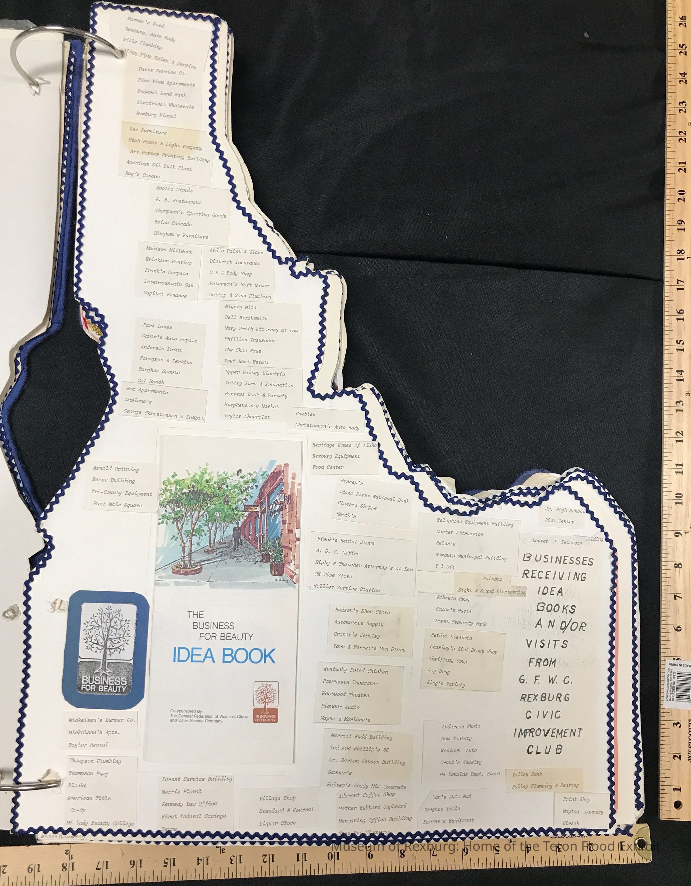 This page shows an index of businesses, as well as 'The Business for Beauty Idea Book' pamphlet. The caption on the page reads: Businesses Receiving Idea Books and/ or Visits from G.F.W.C. Rexburg Civic Improvement Club.