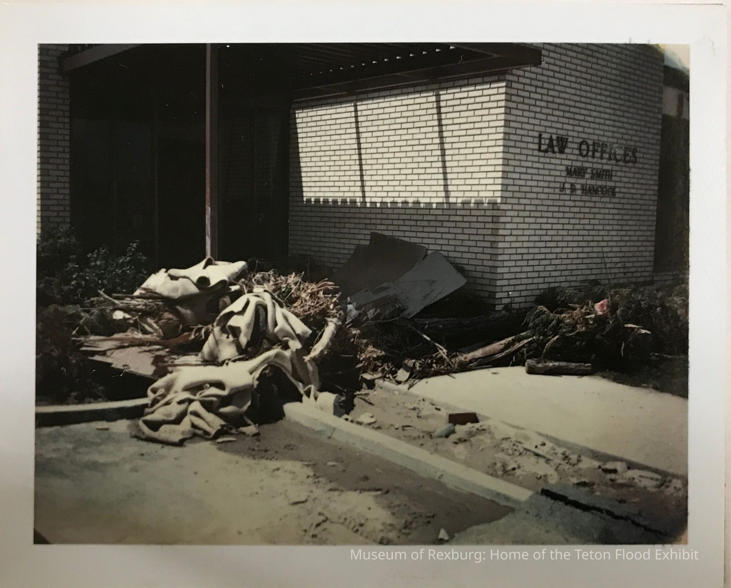 A photo showing Mary Smith Law Office with flood damage and mud outside the building. This photo is in the bottom left hand corner.