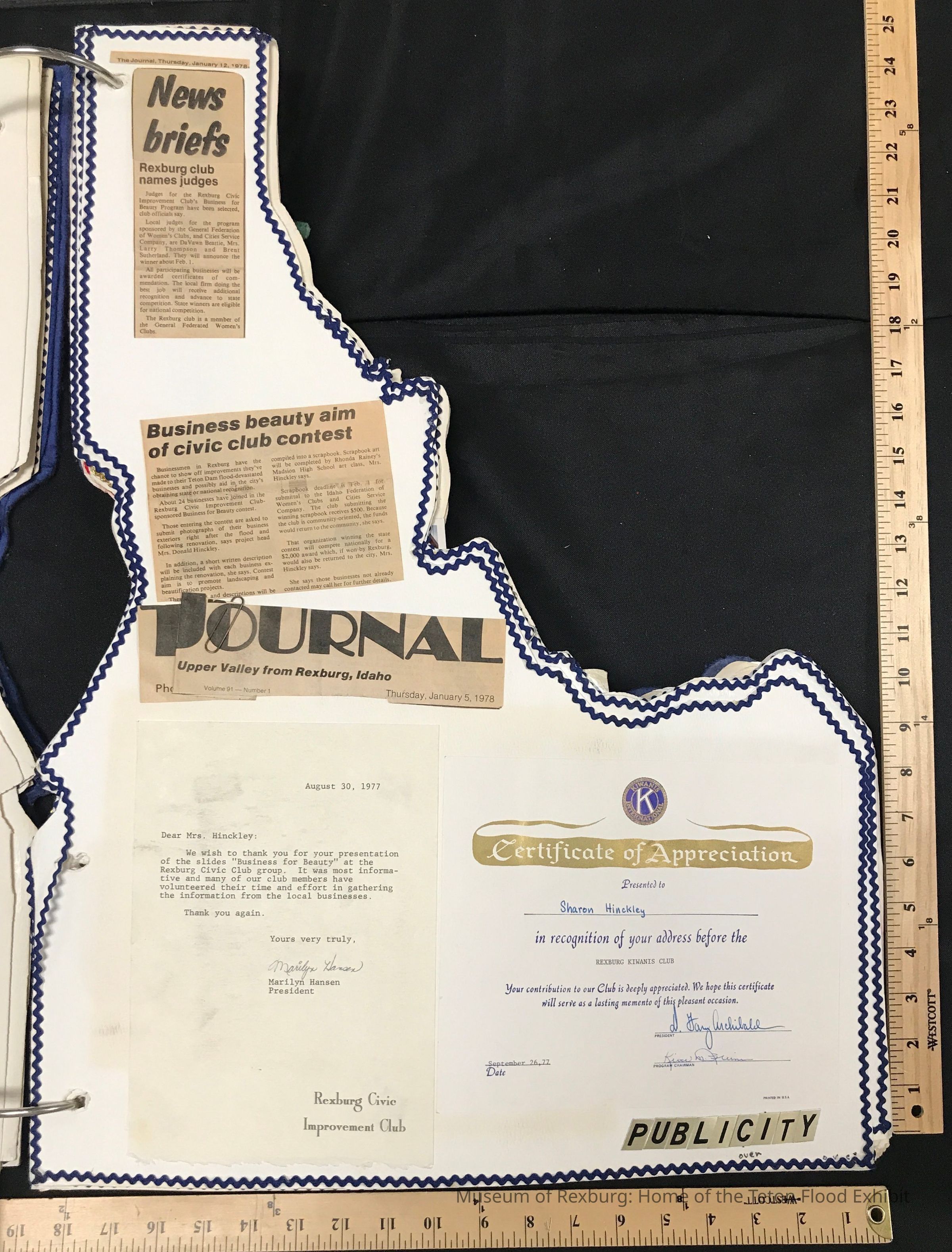 Double-sided page of newspaper clippings featuring the publicity garnered by the beautifying of the damaged businesses in Rexburg. A letter dated August 30, 1977 to Mrs. Hinkley reads: