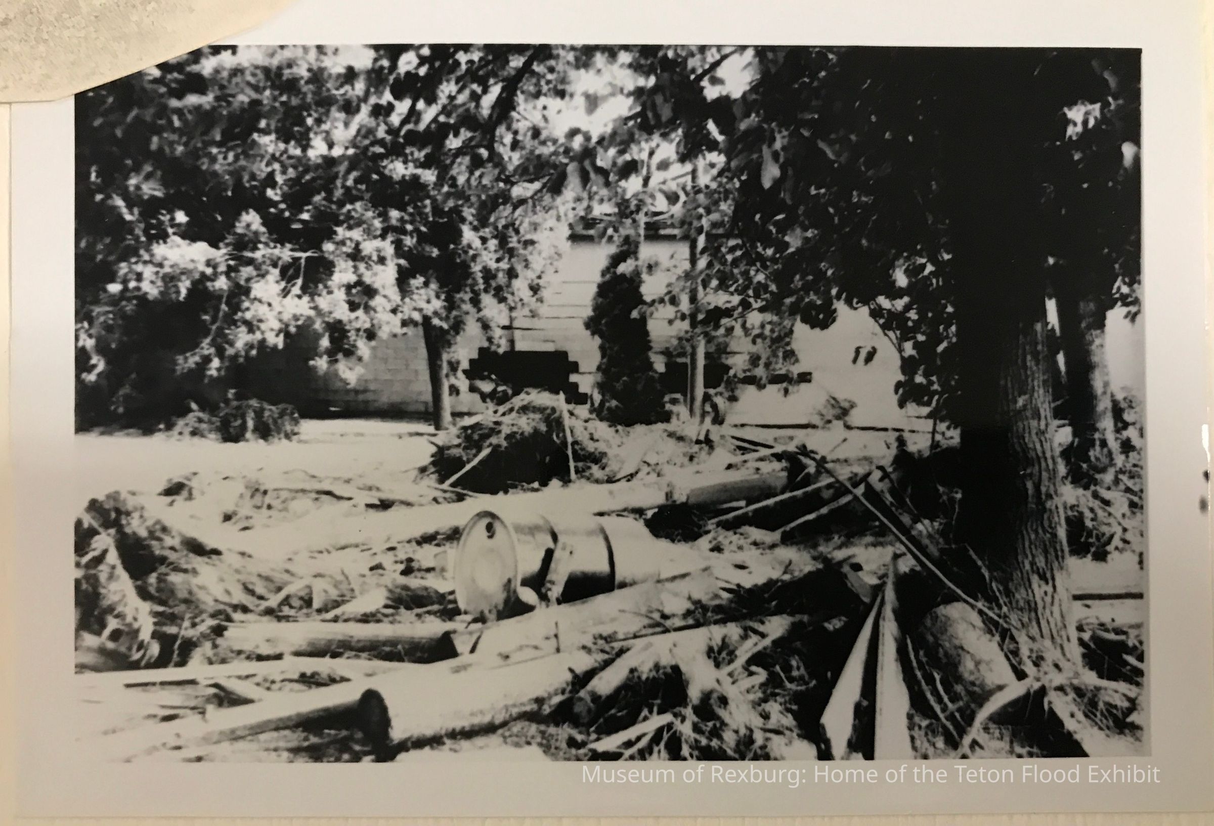 A B&W photo of Rexburg Food Center showing more flood debris - a large can, and logs. This photo is the 2nd photo located near the left hand side of the page, below the potato drawing.