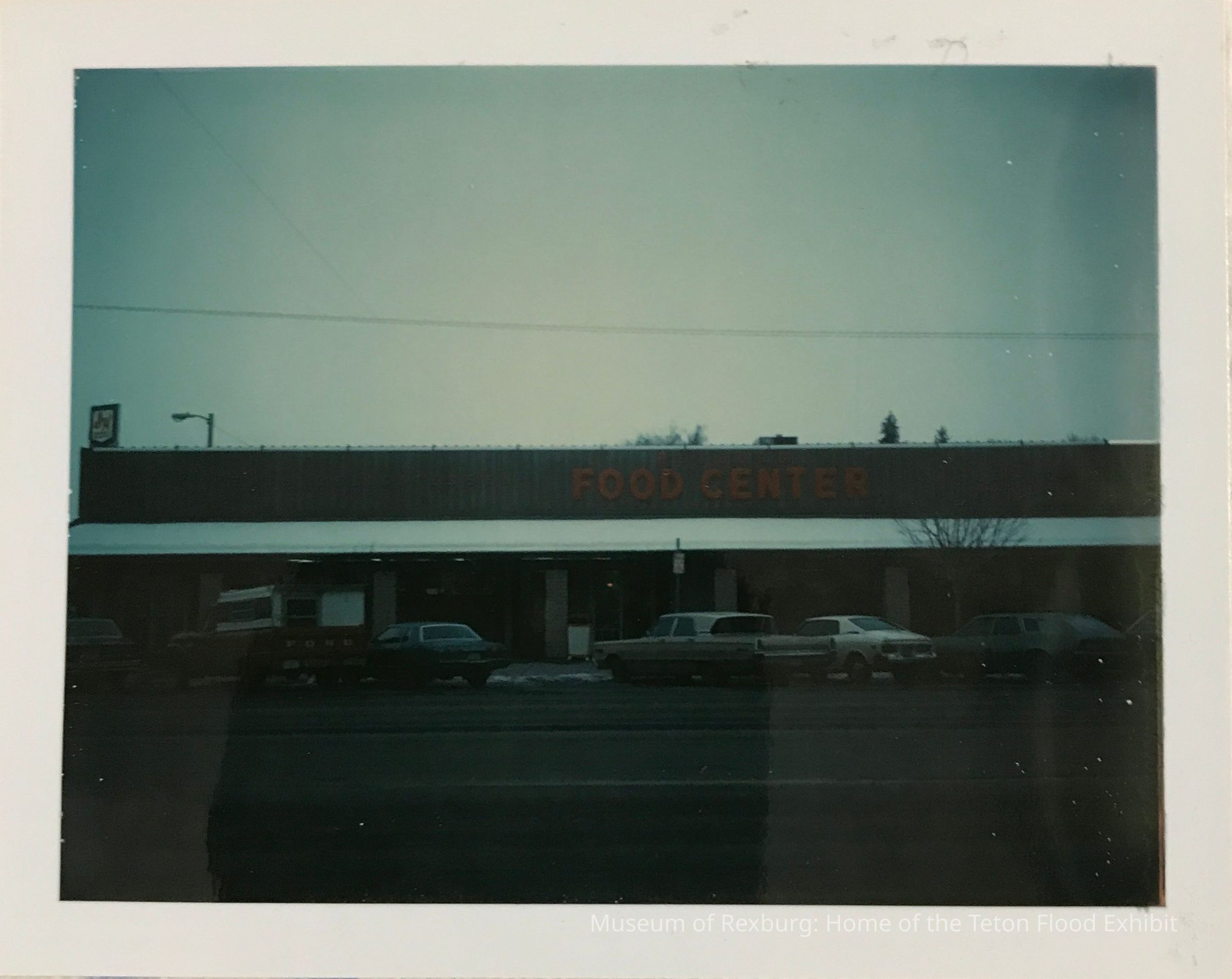 A view of Rexburg Food Center from the front, after restoration. Taken at dusk, not much is visible, a row of cars and snow on the roof. This photo is the bottom left on the page.