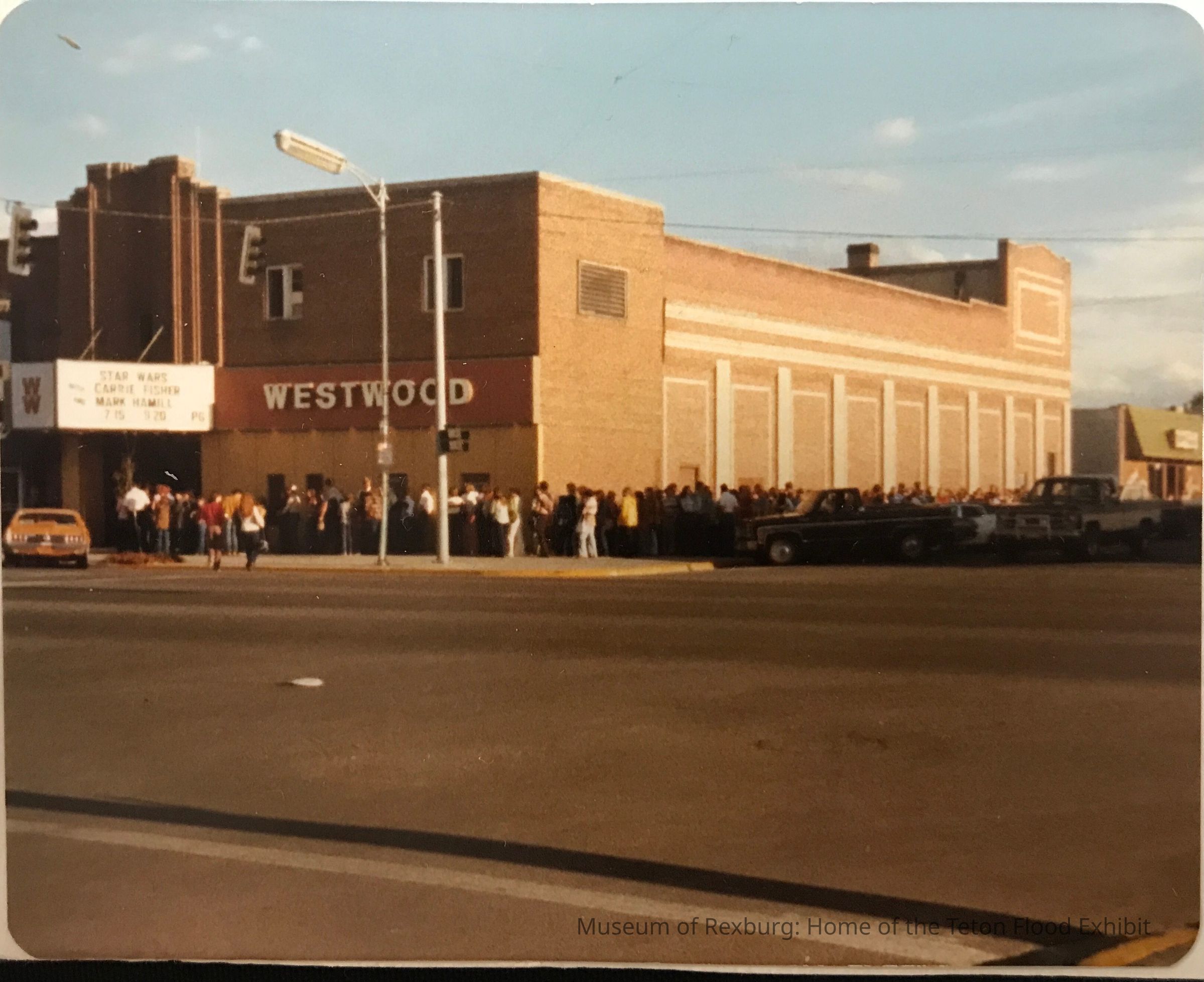 Photo of the Westwood Theater after restoration. A large line of customers is shown wrapping around the building, and Star Wars is on the marquee.