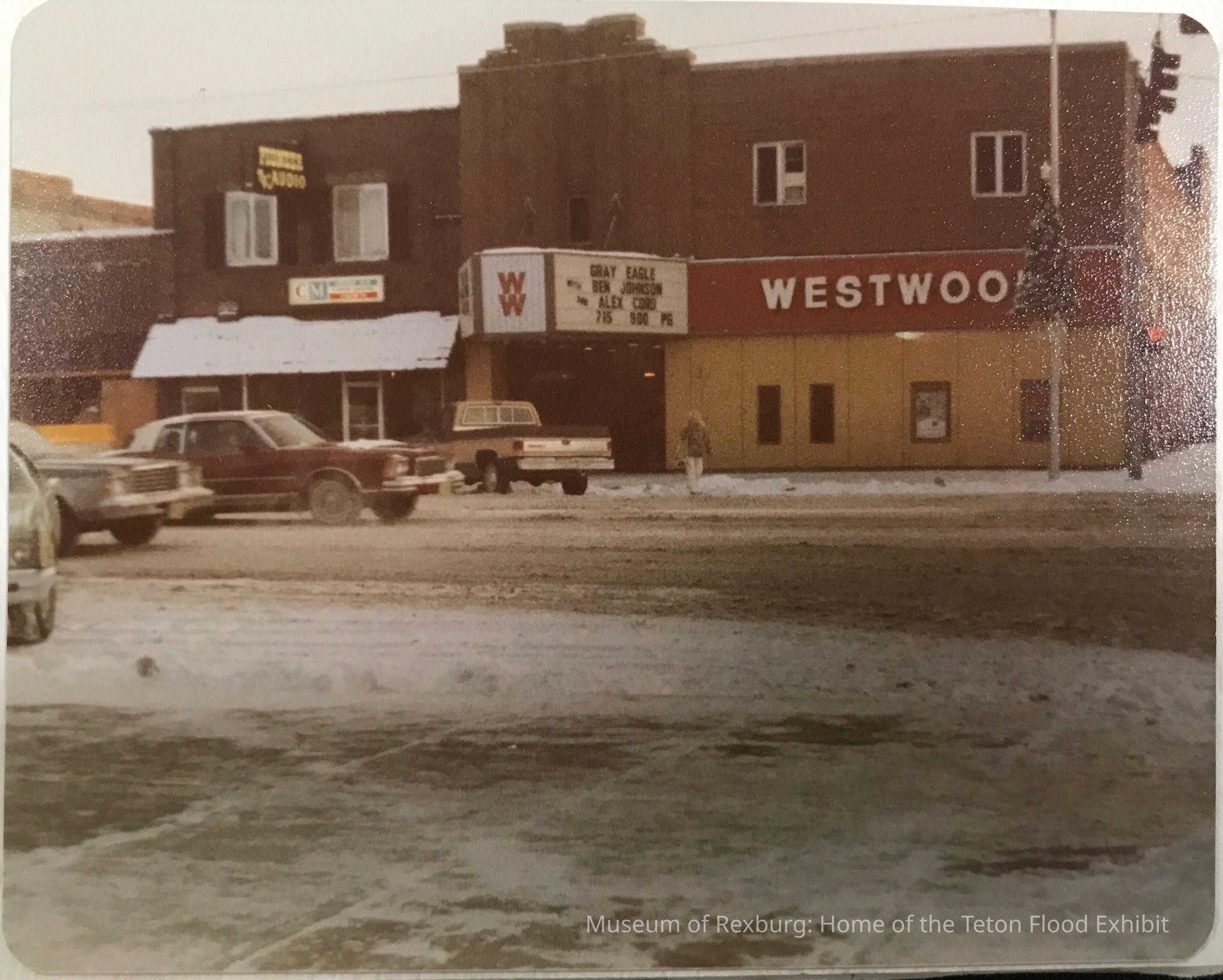 Another photo of the Westwood Theater taken in the winter, as snow is visible in the picture. Gray Eagle is on the marquee.