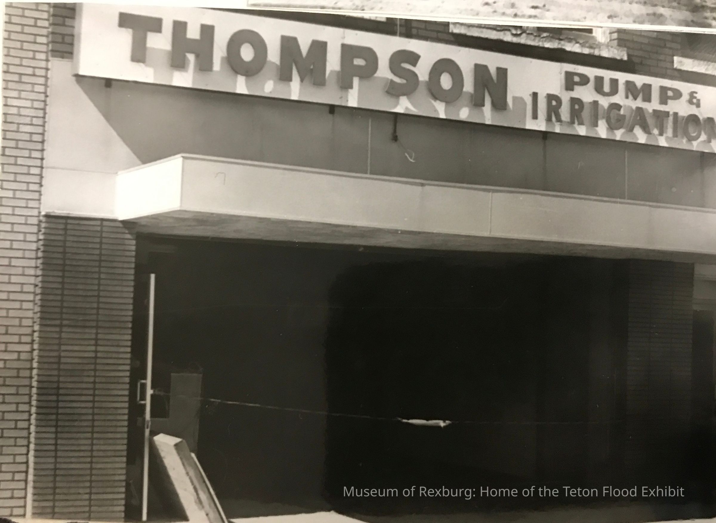 A B&W photo of Thompson Pump & Irrigation closed off. This photo is the middle of 3 photos and is in the lower middle of the page.