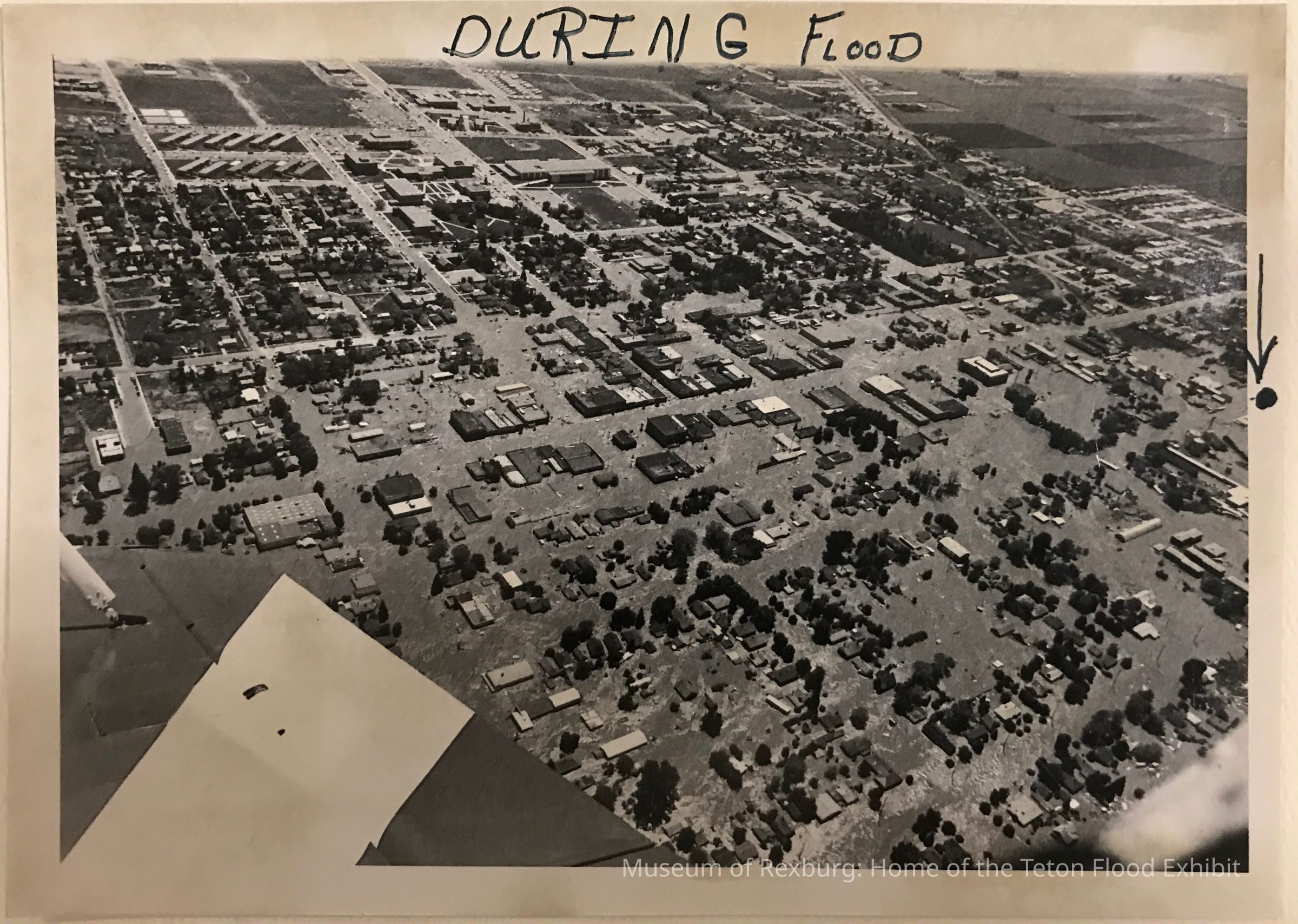 a B&W aerial photo of Rexburg during the flood. Someone has written 'During Flood' at the top, and also indicated with an arrow & dot where Targhee Sports is.