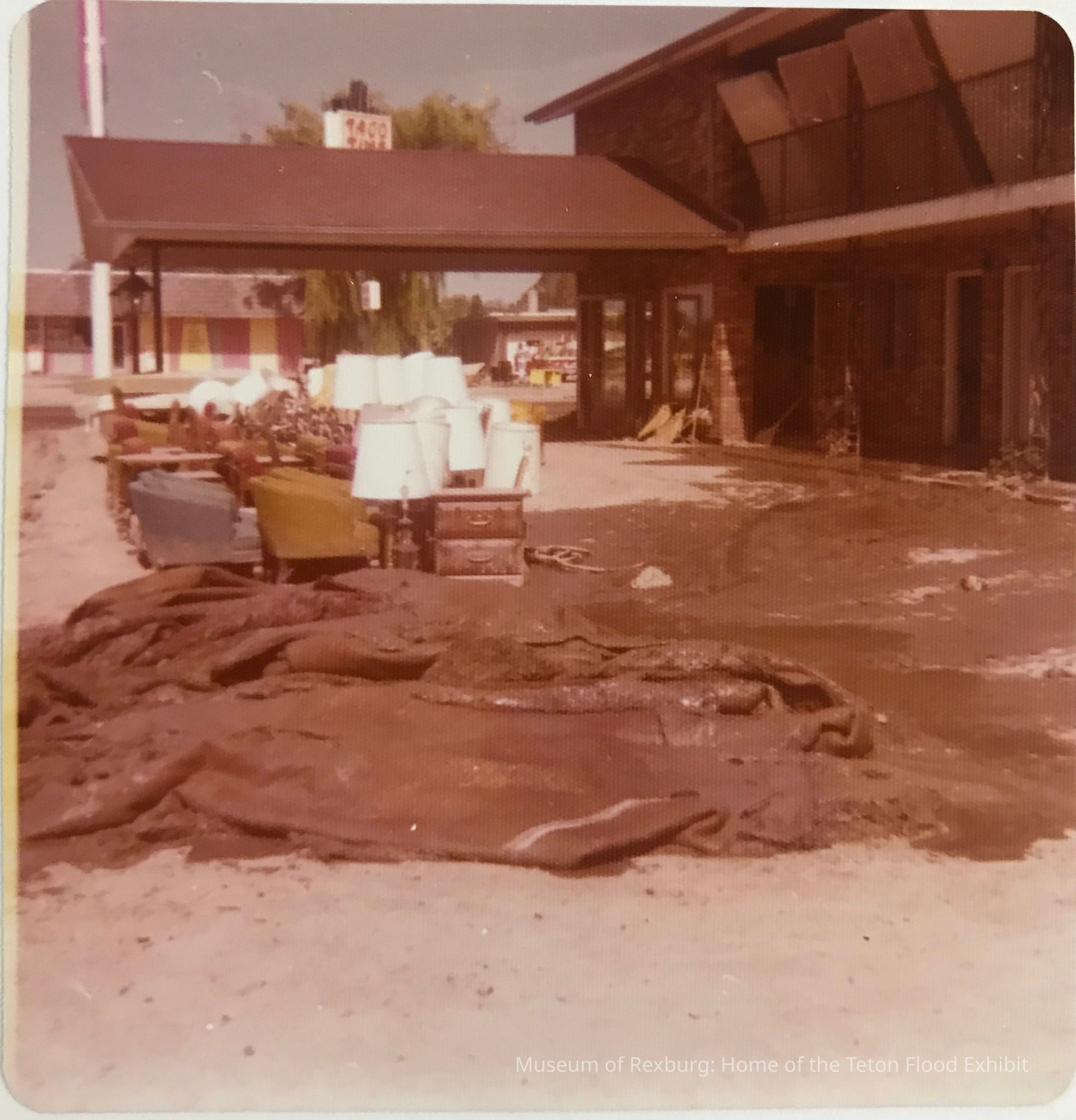 This second photo of Viking Motel shows the parking lot full of mud and ruined furniture. This photo is in the middle of the page, between the 1st and 3rd photos.