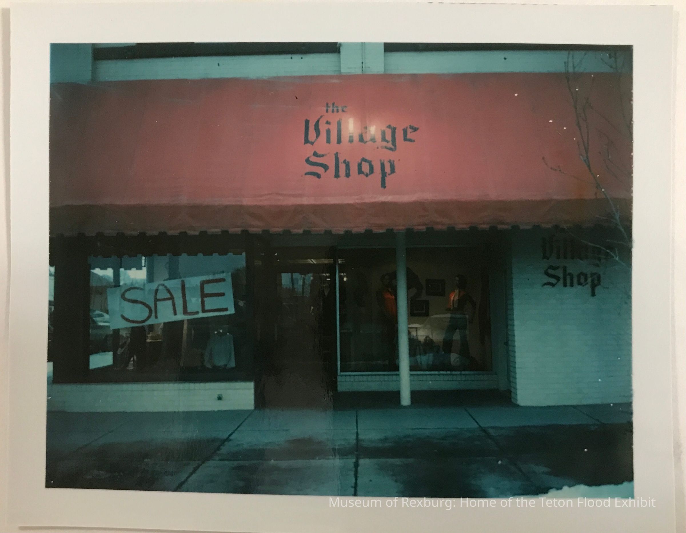 A photo of Village Shop after restoration & cleanup. There is a 'SALE' sign in the window, and this photo is located on the reverse side of the scrapbook page, in the middle of the page.