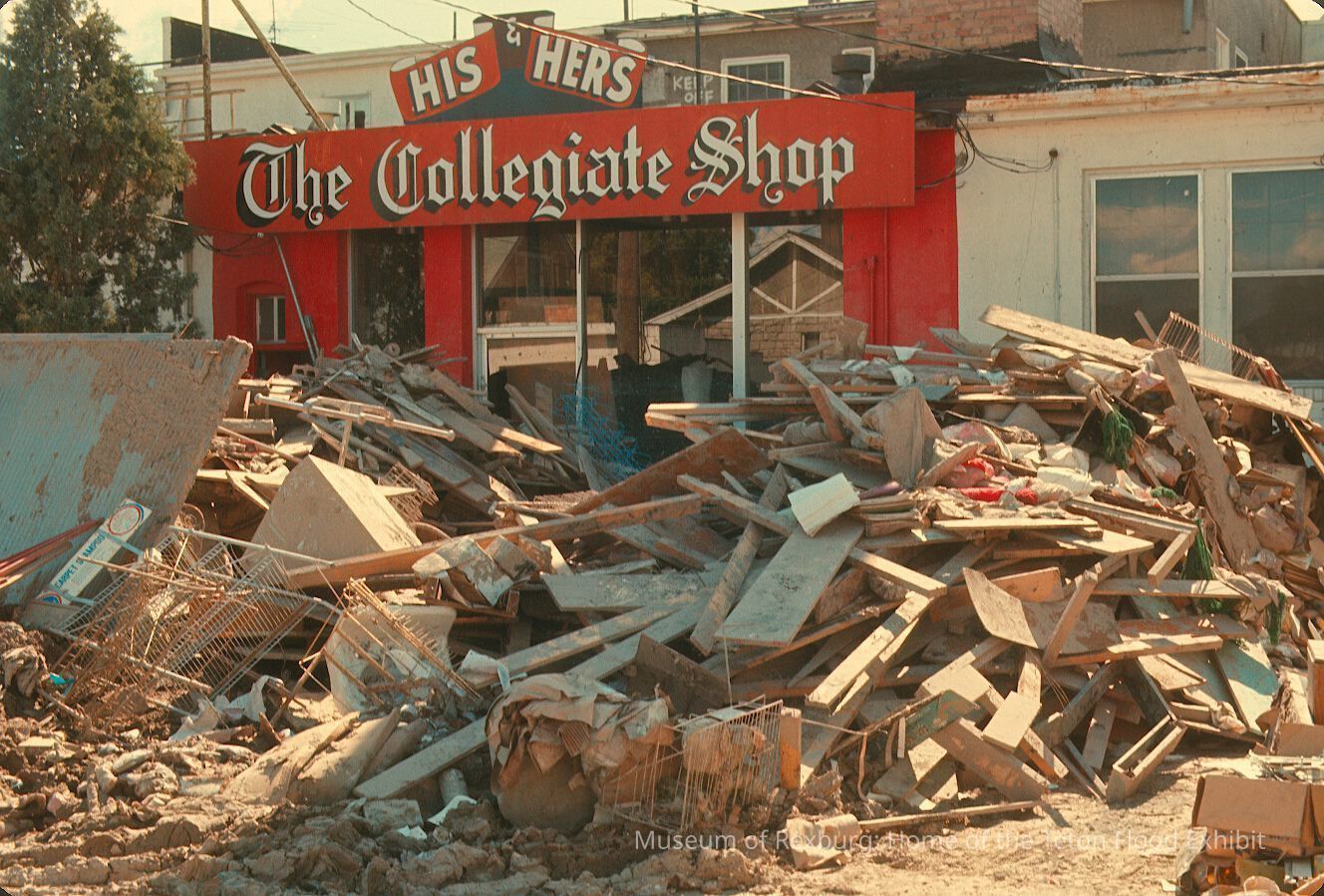 This photo was taken in colour. Ths subject of the photo is the Collegiate Shop. The paneling for the is a deep red colour. The sign reads "His & Hers The Collegiate Shop". The parking lot of the shop is covered in debris of all kinds. The debris takes up most of the shot. The photo is a part of a digital collection donated to the museum by Rick Davis.
