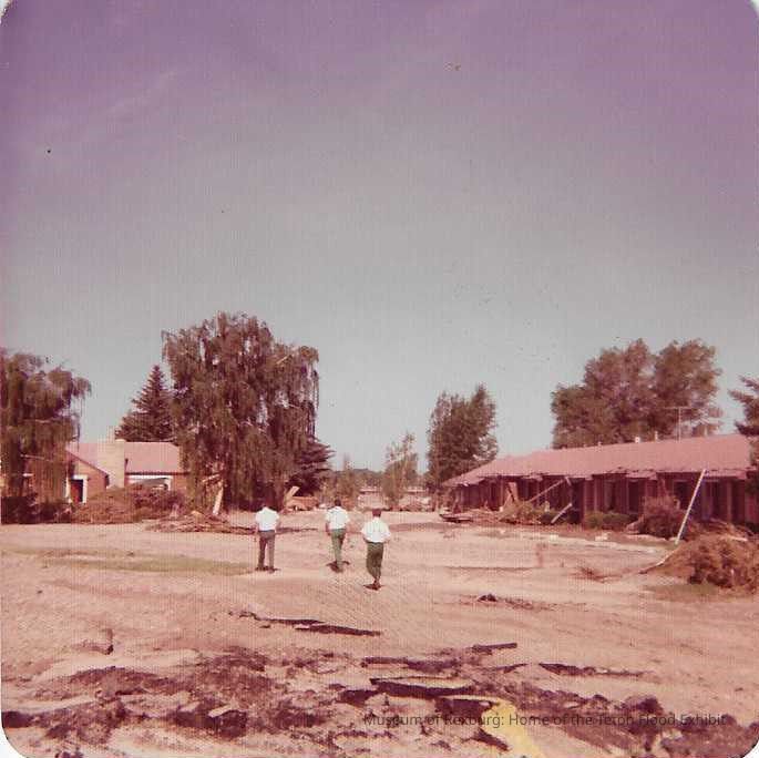 This photo is in color. There are two homes that have experienced flood damage. In the center of the photo are three men. Each of the have there backs facing the camera. The are wearing white shirts with green pants. These men are walking away from the camera. There are lots of mud and debris in this photo. This photo is 3.5 x 3.5 inches big.