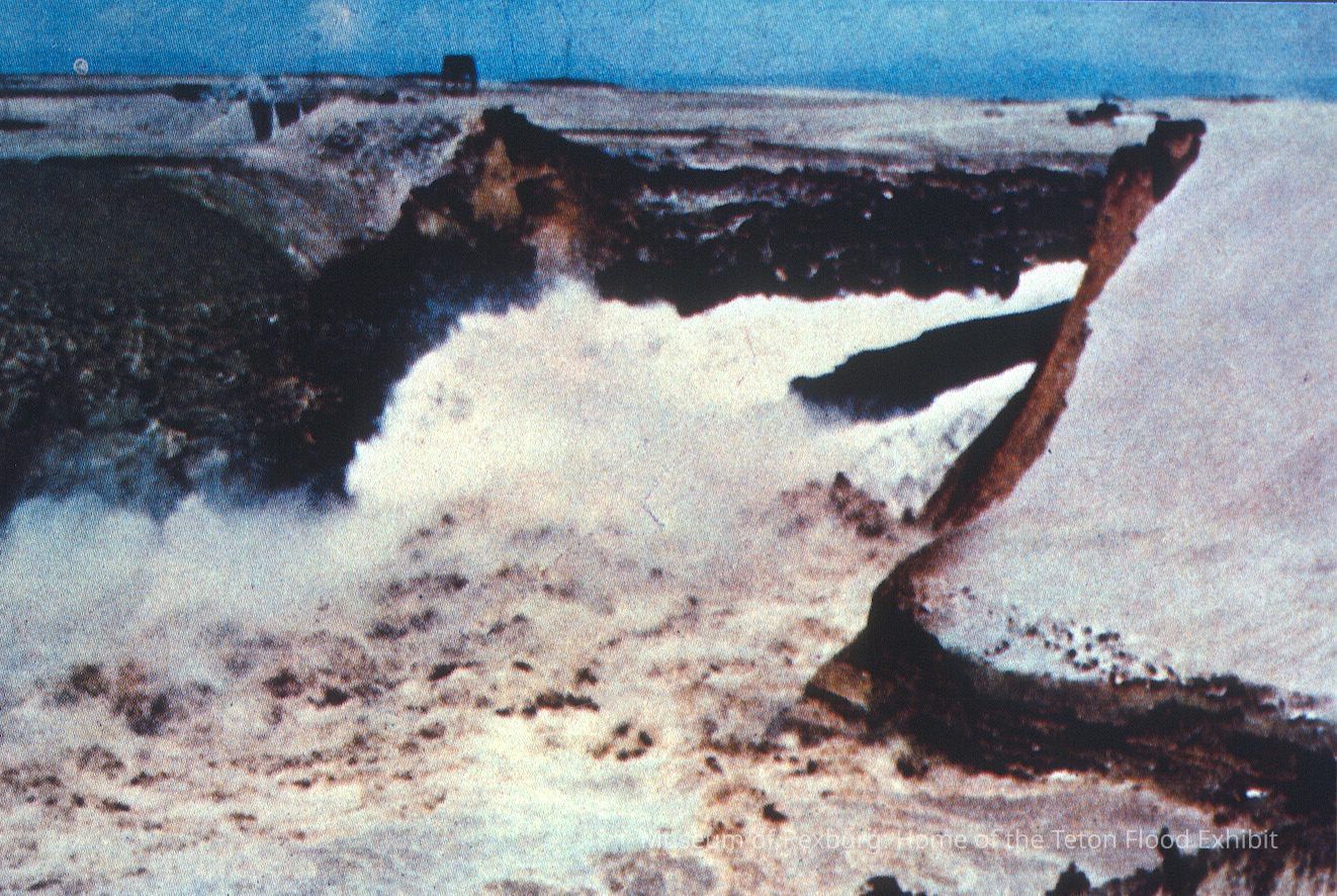 The photo was taken from the TIME's magazine issue on the failure of the Teton Dam. The photo was taken after the dam broke and the water came rushing through the opening. The focus of the photo is the opening of the dame and the water looking like billowing clouds is moving at terrible speeds from the reservoir. The photo is a part of a digital collection donated to the museum by Rick Davis.