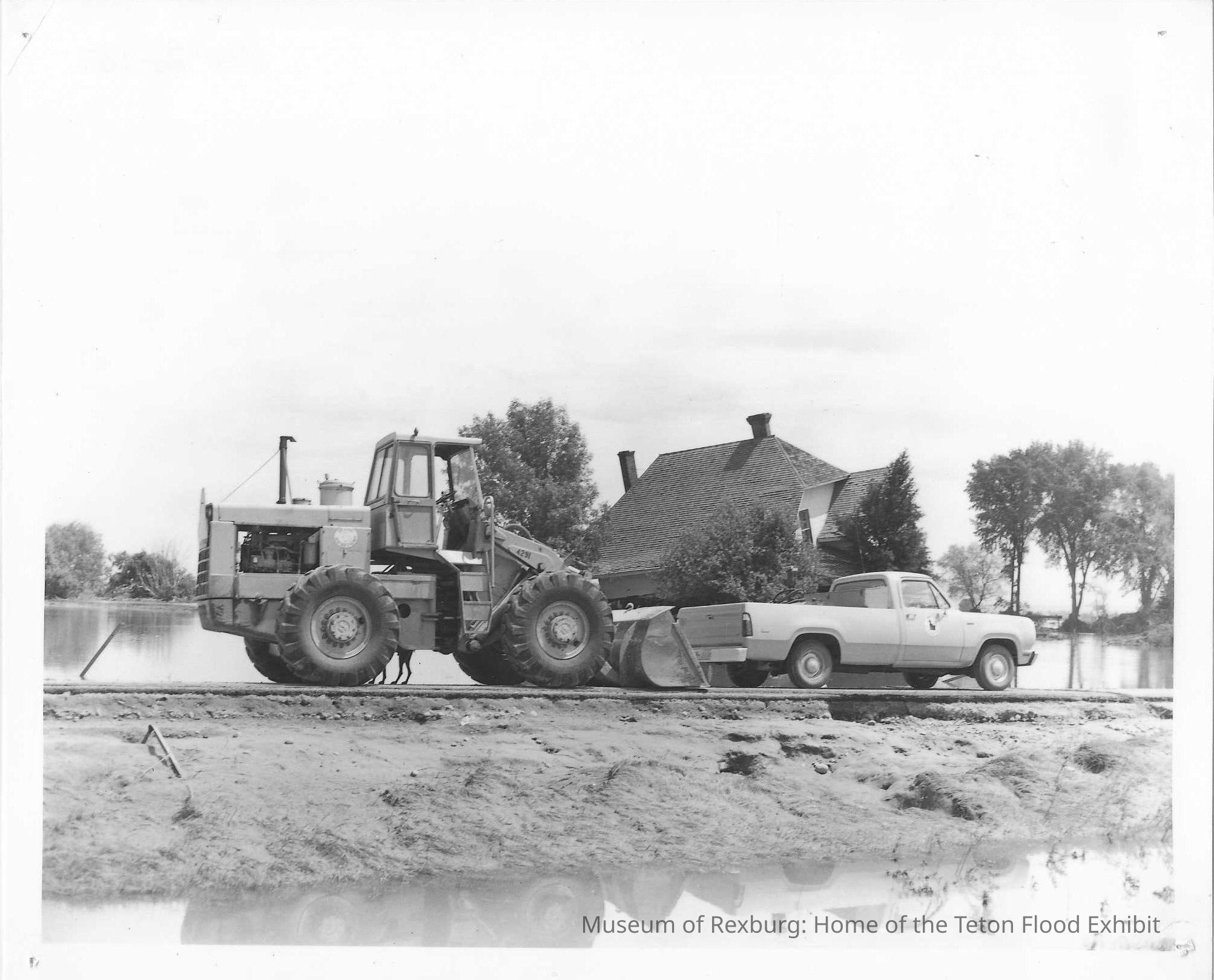 This photo is an 8x10 and is black and white and is also laminated. A large tractor is on the left center of the photo and a truck is on the right center, They are sitting on a road that is surround by water on both sides. There is a white house behind the truck that looks like it might be off its foundation.