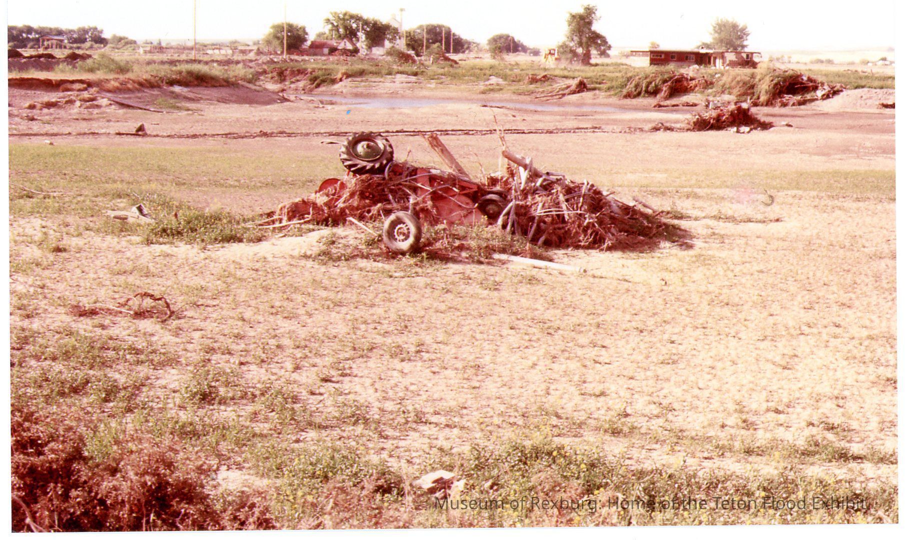 This photo was taken in colour. The subject of the photo is a field with a broken red tractor in the middle. The background contains a couple of houses and a line of trees. The tractor is also covered in wood and foliage debris. The dimensions of the photo 6" X 4".