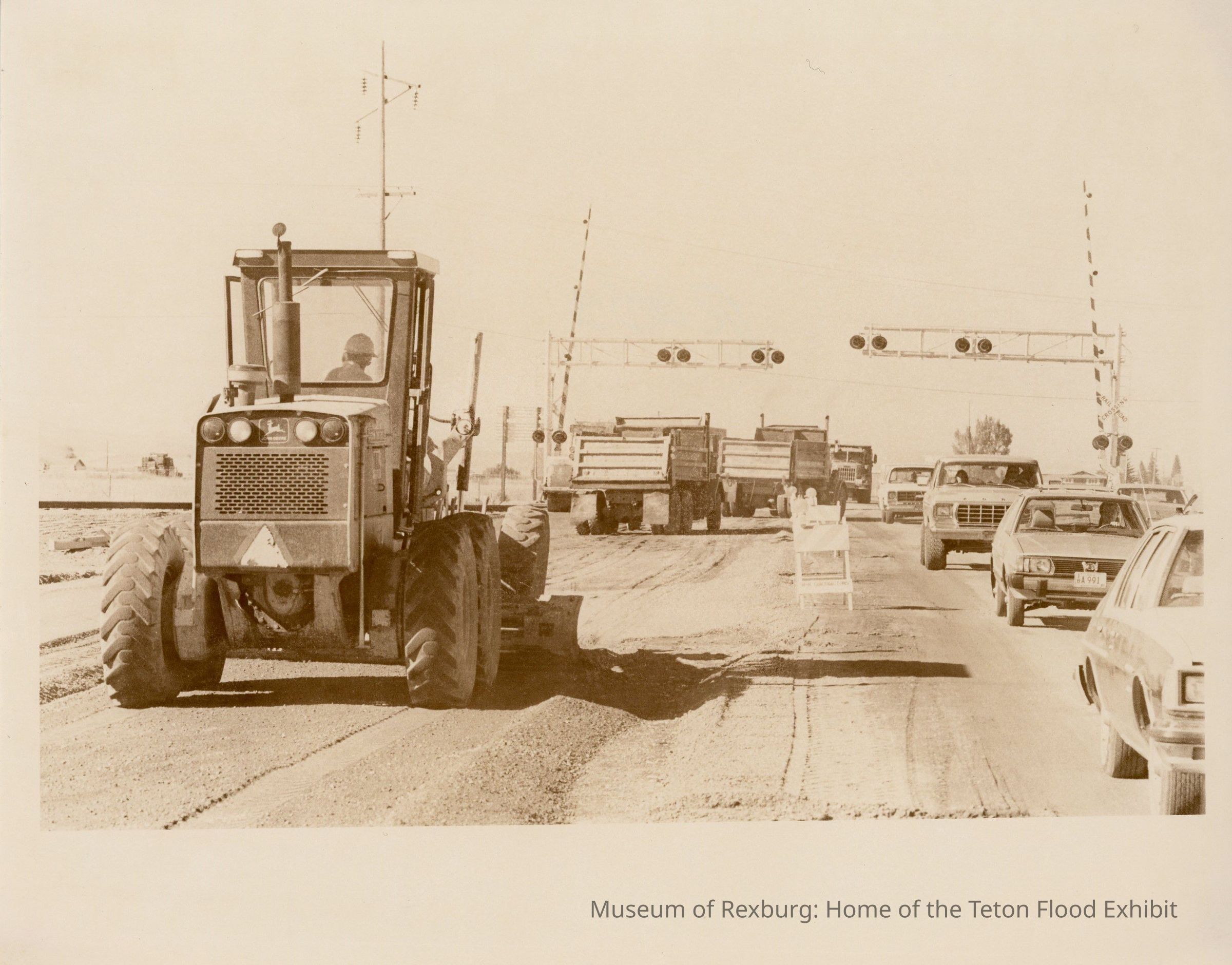 This photo shows two lines of traffic: on the left large construction trucks & a tractor moving away from the view of the photo. On the right hand side is a line of cars coming towards the camera. The road is all gravel & traffic barricades are in the middle of the road. A train crossing is in the middle of the photo, under which the traffic is coming & going. The license plate on one of the cars coming towards the camera reads: 1B A 991. The tractor is a John Deere. On the back of the photo in blue pencil is "Robs". This photo is 8x10". This photo comes from the old Standard Journal Warehouse located at 23 S 1st E.